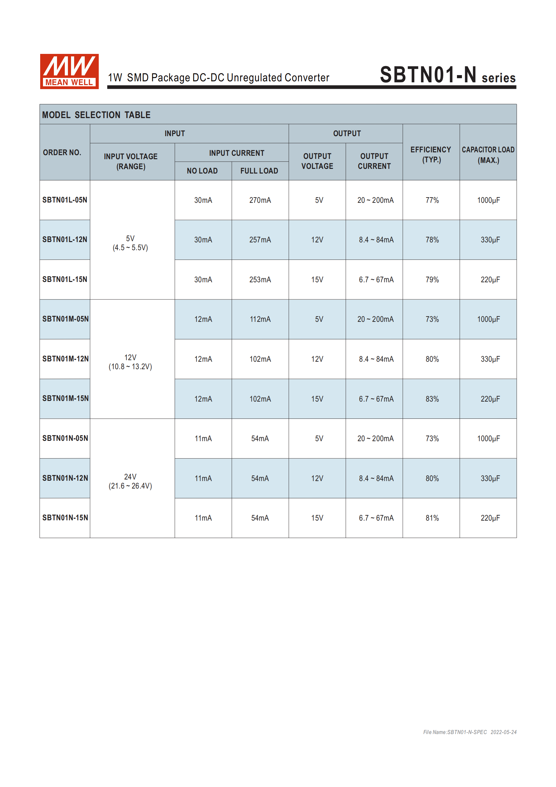 SBTN01+輸入電壓代碼+輸出電壓+規(guī)格后綴,其中輸入電壓分 4 檔,輸出電壓涵蓋 3.3V/5V/9V/12V/15V/24Vdc,規(guī)格后綴空白為標準品、SC 為可選品;輸入電壓檔位(含浪涌電壓):| 輸入代碼 | 額定電壓范圍 | 浪涌電壓(最長 100ms) | 推薦慢熔保險絲規(guī)格 ||----------|--------------|----------------------|--------------------|| K | 2.97~3.63Vdc | 9Vdc(3.3Vin 通用)| 1000mA || L | 4.5~5.5Vdc | 9Vdc(5Vin 通用)| 750mA || M | 10.8~13.2Vdc | 16Vdc(12Vin 通用)| 300mA || N | 21.6~26.4Vdc | 30Vdc(24Vin 通用)| 150mA |