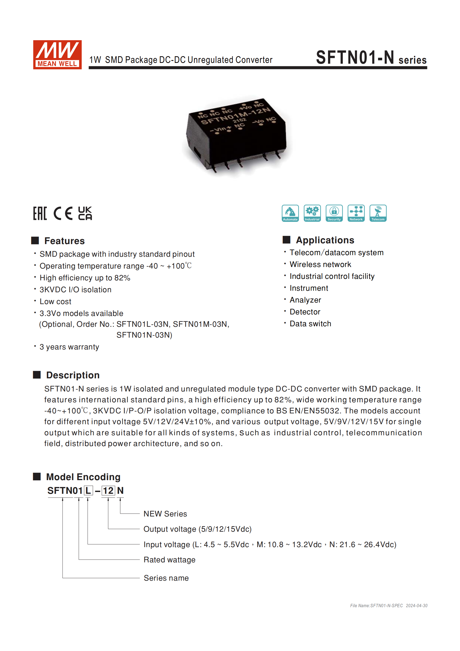 SFTN01-N 系列是明緯推出的1W SMD 封裝DC-DC 非穩(wěn)壓轉(zhuǎn)換器,具備工業(yè)標準引腳,工作溫度覆蓋 **-40 ~ +100℃,效率最高達82%,輸入輸出隔離電壓為3KVDC**,提供5V/9V/12V/15V輸出、4.5~5.5V/10.8~13.2V/21.6~26.4V三類輸入電壓選擇,符合BS EN/EN55032電磁兼容標準,擁有3 年保固,封裝尺寸為15.2410.97.1mm,適用于電信 / 數(shù)據(jù)通信、工業(yè)控制、儀器等領域,且通過EAC TP TC 020/2011認證。