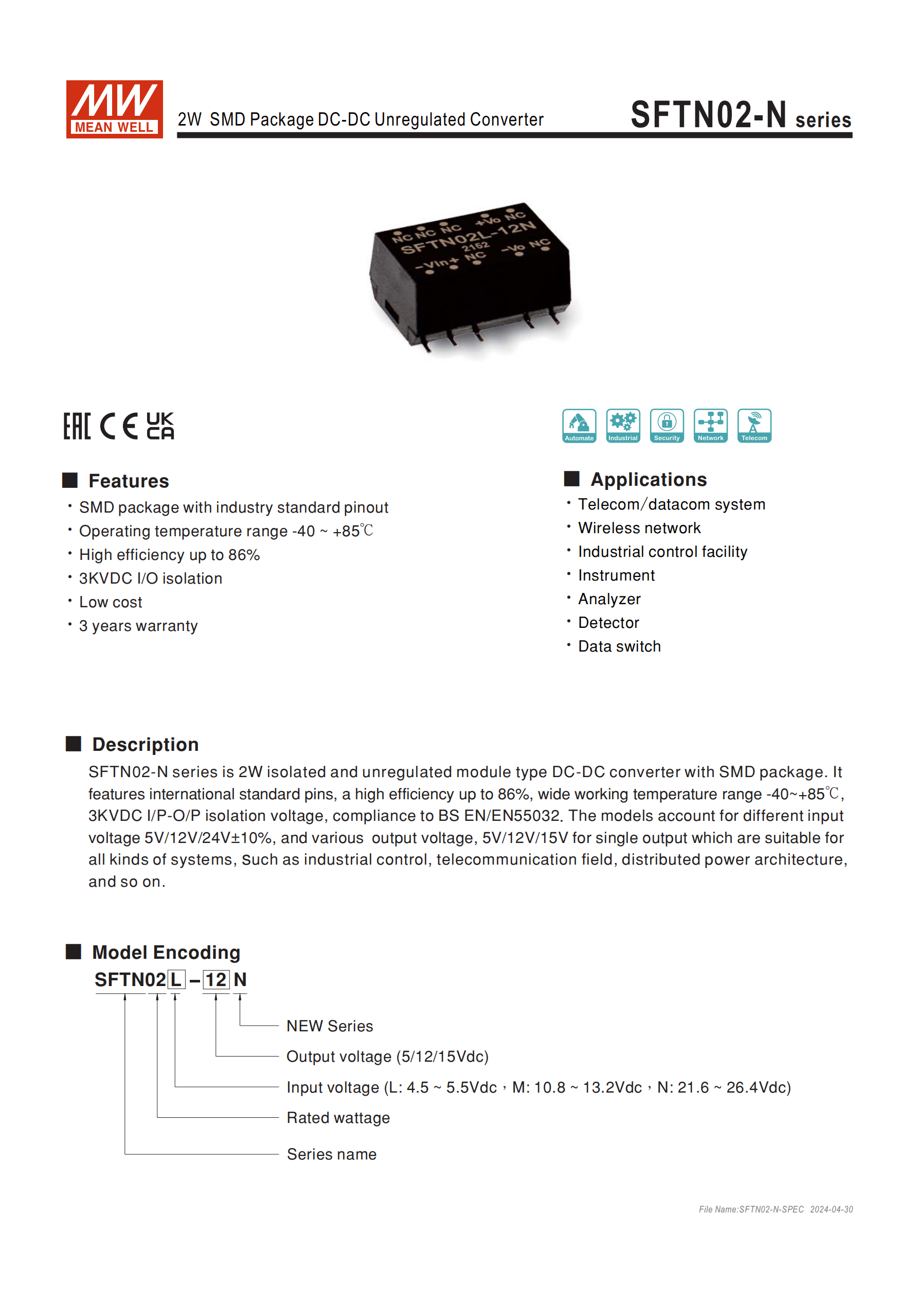產(chǎn)品名稱:SFTN02-N 系列2W SMD 封裝 DC-DC 非穩(wěn)壓轉(zhuǎn)換器,為明緯新系列隔離型模塊電源