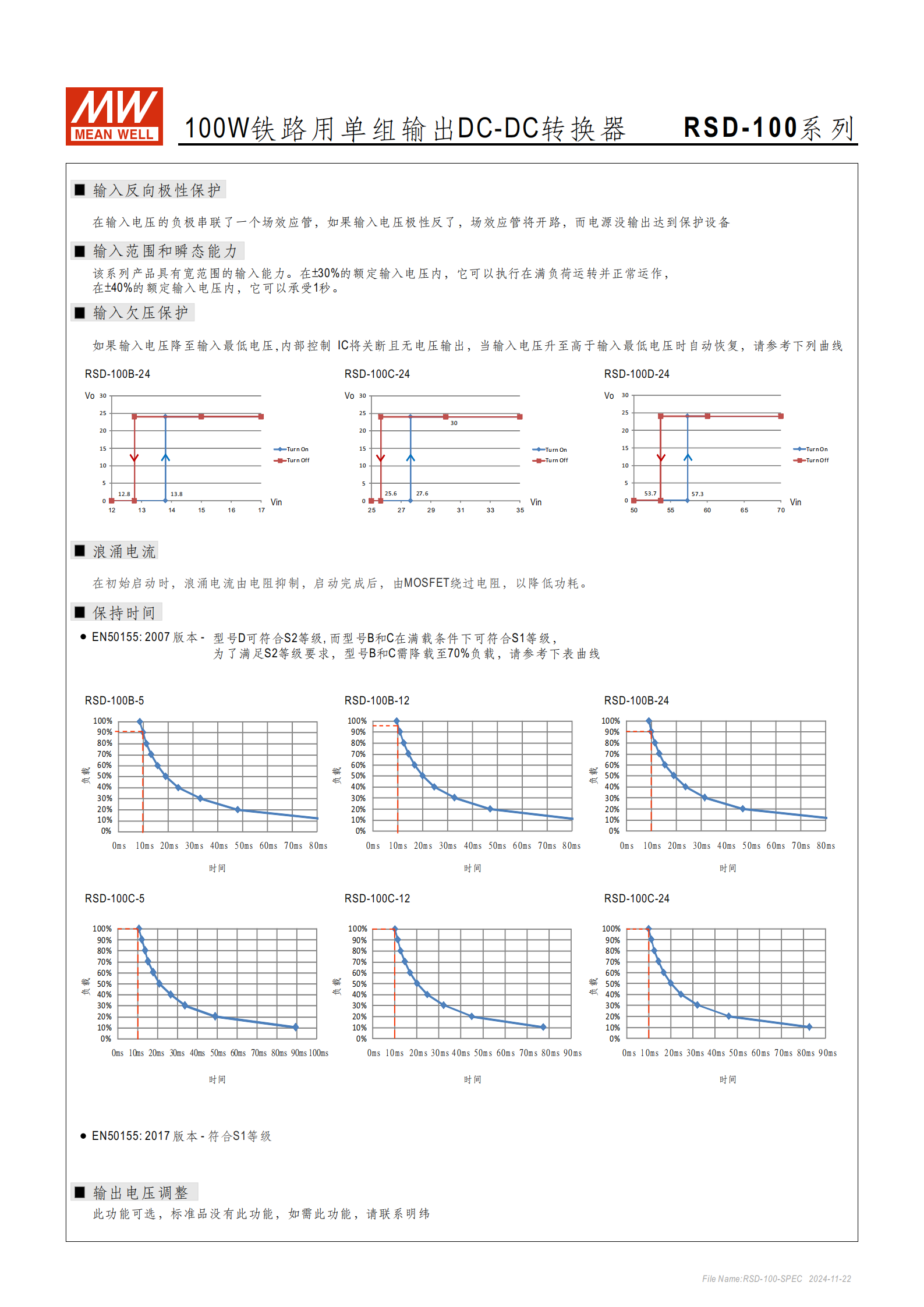 RSD-100D:高端款,效率 90%-91%,輸入電壓范圍明確為57.6~154VDC,保險絲規(guī)格 3.15A,直接符合 EN50155 S2 保持時間等級,是高壓鐵路場景的優(yōu)選型號(B/C 類需降載至 70% 才能滿足 S2 等級)。