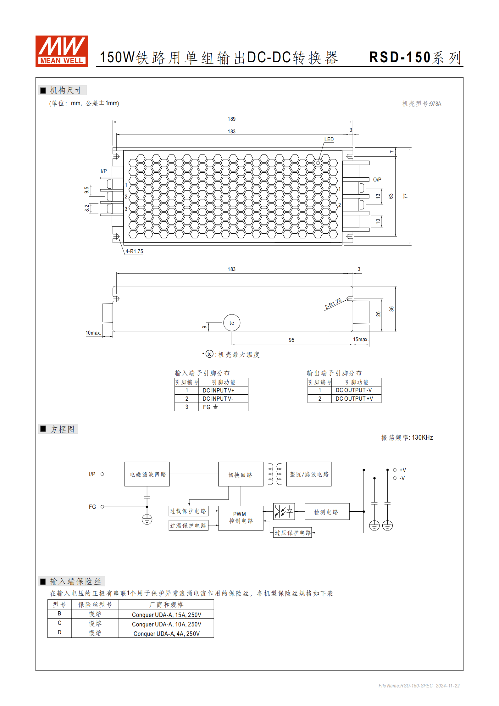 RSD-150 系列為明緯研發(fā)的150W 鐵路專用單組輸出 DC-DC 轉換器,是鐵路系統(tǒng)配套的電源器件,核心特性如下: