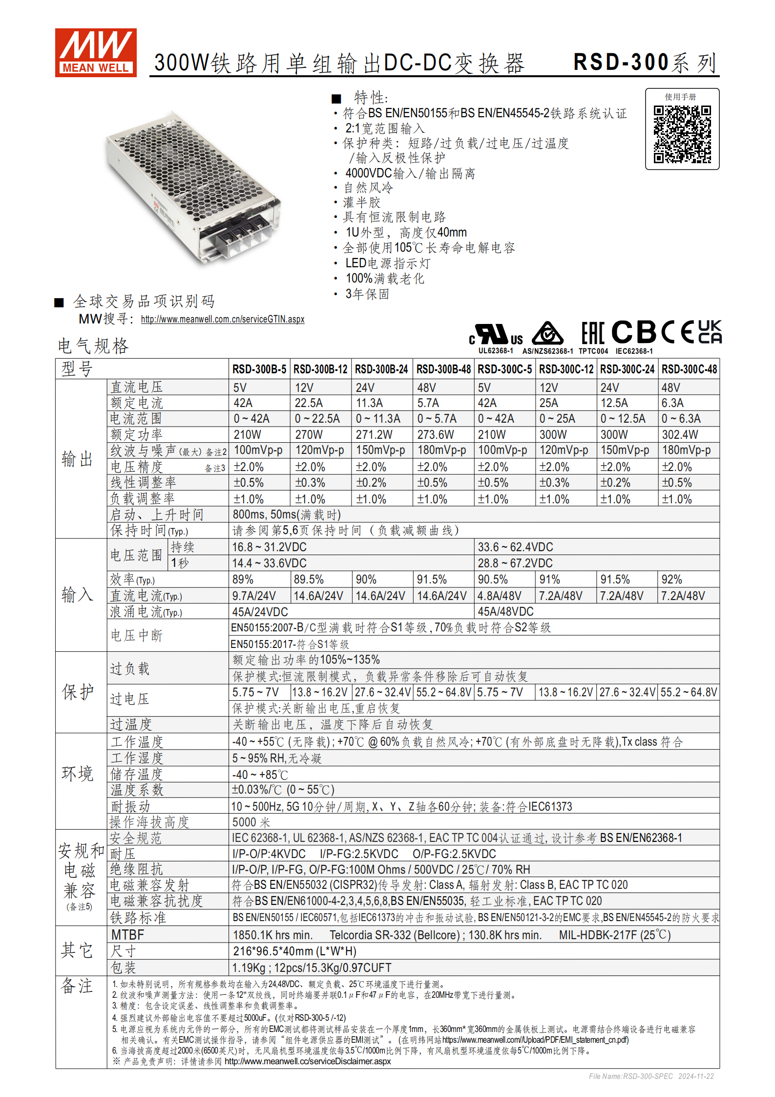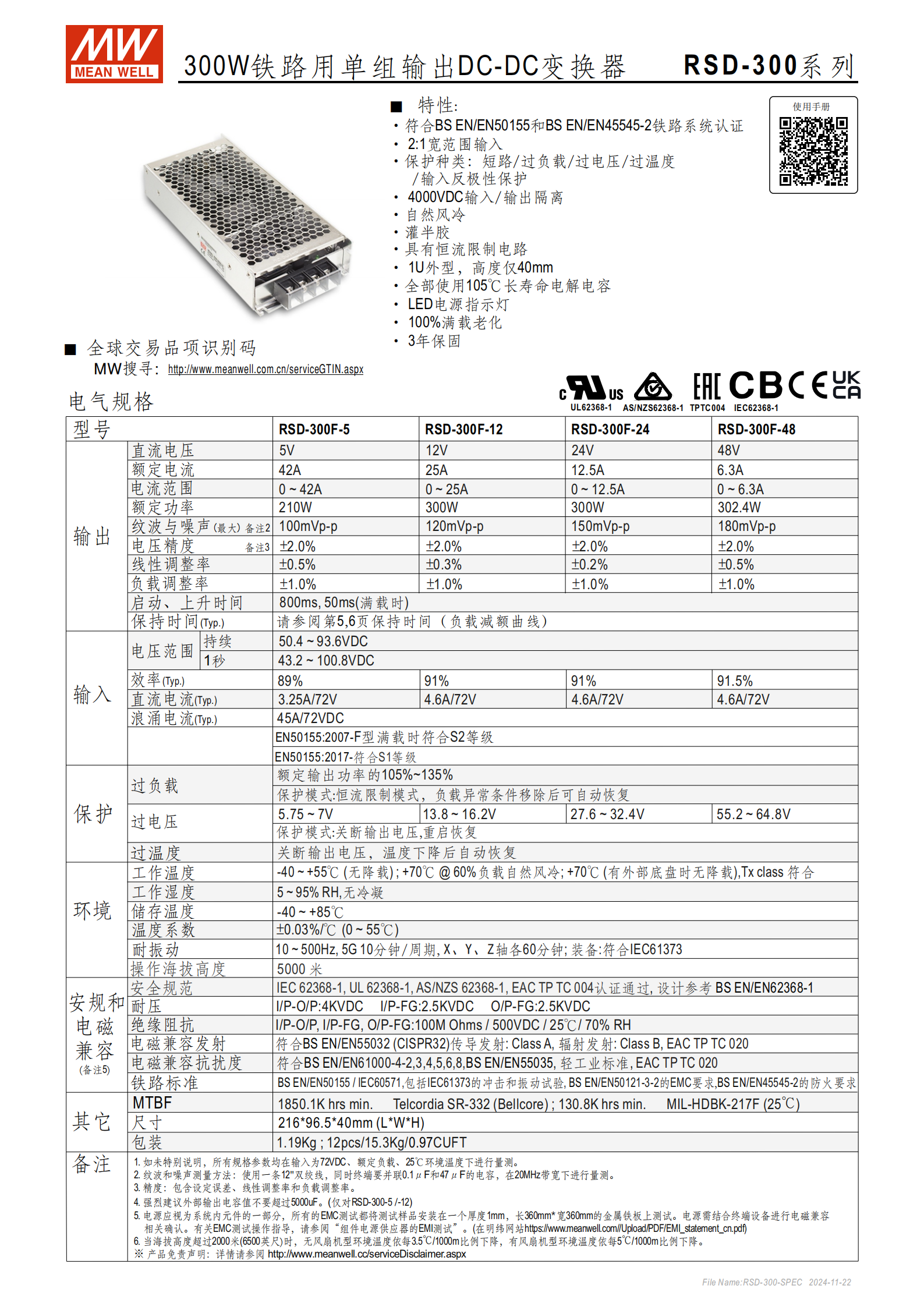 RSD-300 系列為明緯研發(fā)的300W 鐵路專用單組輸出 DC-DC 變換器,是適配鐵路系統(tǒng)的專用電源產(chǎn)品,核心特性如下: