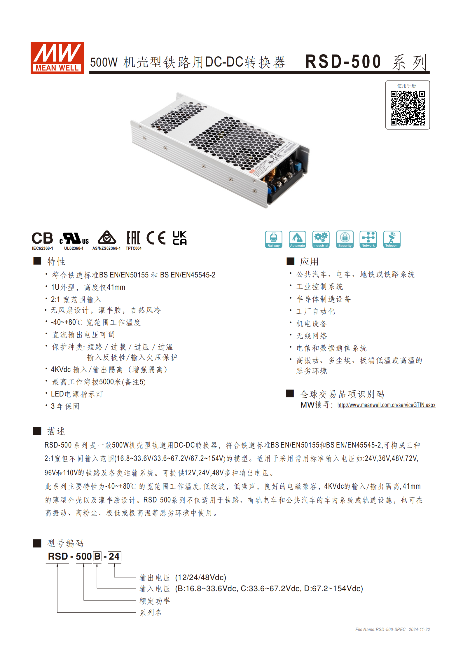RSD-500 系列為明緯生產的500W 機殼型鐵路專用 DC-DC 轉換器,是面向軌道交通及惡劣工業(yè)環(huán)境的電源轉換產品,核心符合鐵道標準EN50155(2017 版)和EN45545-2,同時通過IEC62368-1、UL62368-1、AS/NZS62368-1等安規(guī)認證,提供3 年保固,為全球交易品項。