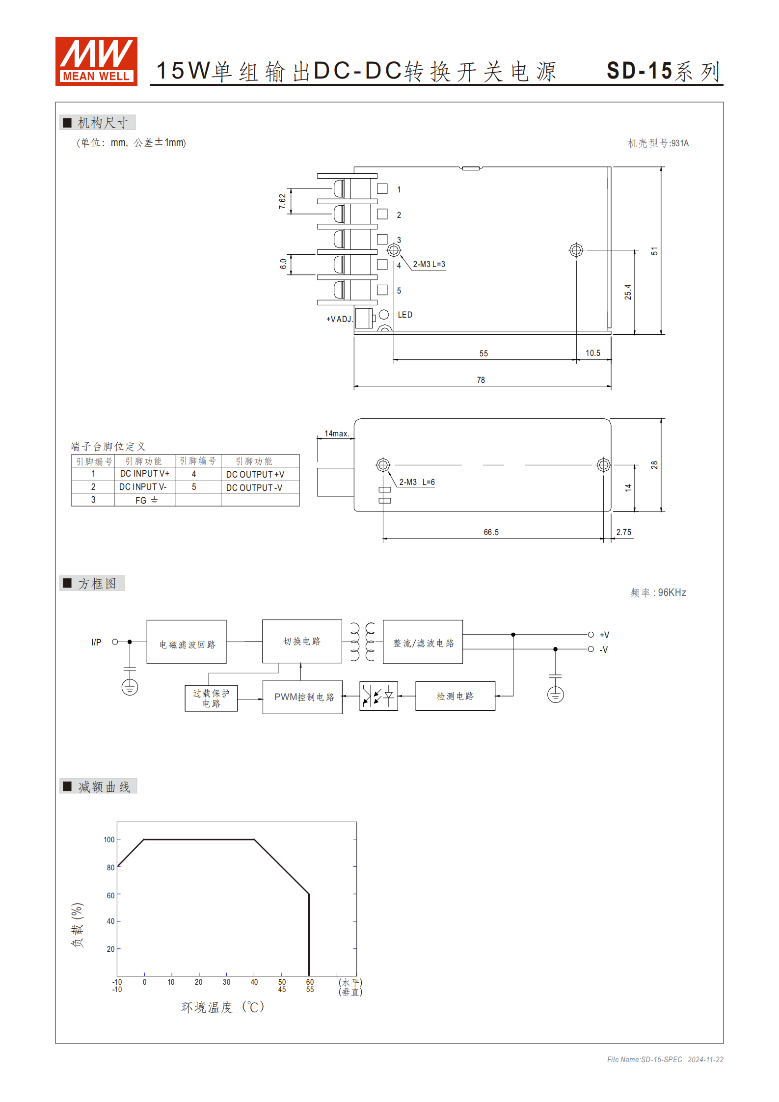 SD-15 系列為明緯 15W 單組輸出 DC-DC 變換器,具備2:1 寬范圍輸入特性,提供 5V/3A、12V/1.25A、24V/0.625A 三種輸出規(guī)格,內(nèi)建 EMI 濾波電路實(shí)現(xiàn)低紋波噪聲,集成短路 / 過(guò)負(fù)載 / 過(guò)電壓三重保護(hù),經(jīng) 100% 滿(mǎn)載老化測(cè)試,擁有高可靠性與 2 年保固;產(chǎn)品在額定條件下效率 68%-79%,電壓精度 ±2.0%,工作溫度 - 10~+60℃,尺寸為 785128mm,MTBF 值最低 3861.2K hrs(Telcordia SR-332 標(biāo)準(zhǔn)),還通過(guò)多項(xiàng) EMC 與安規(guī)認(rèn)證,適配工業(yè)等輕載應(yīng)用場(chǎng)景。