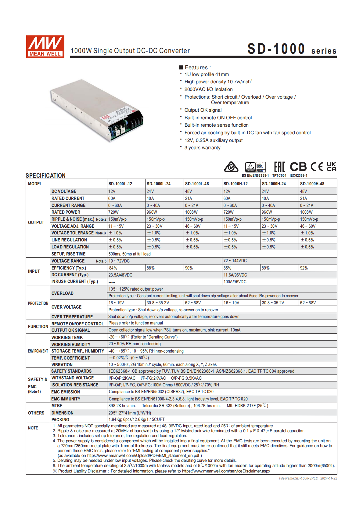 | SD-1000H-48 | 48V | 21A | 1008W | 72~144VDC | 92% | 150mVp-p | 46~60V |
