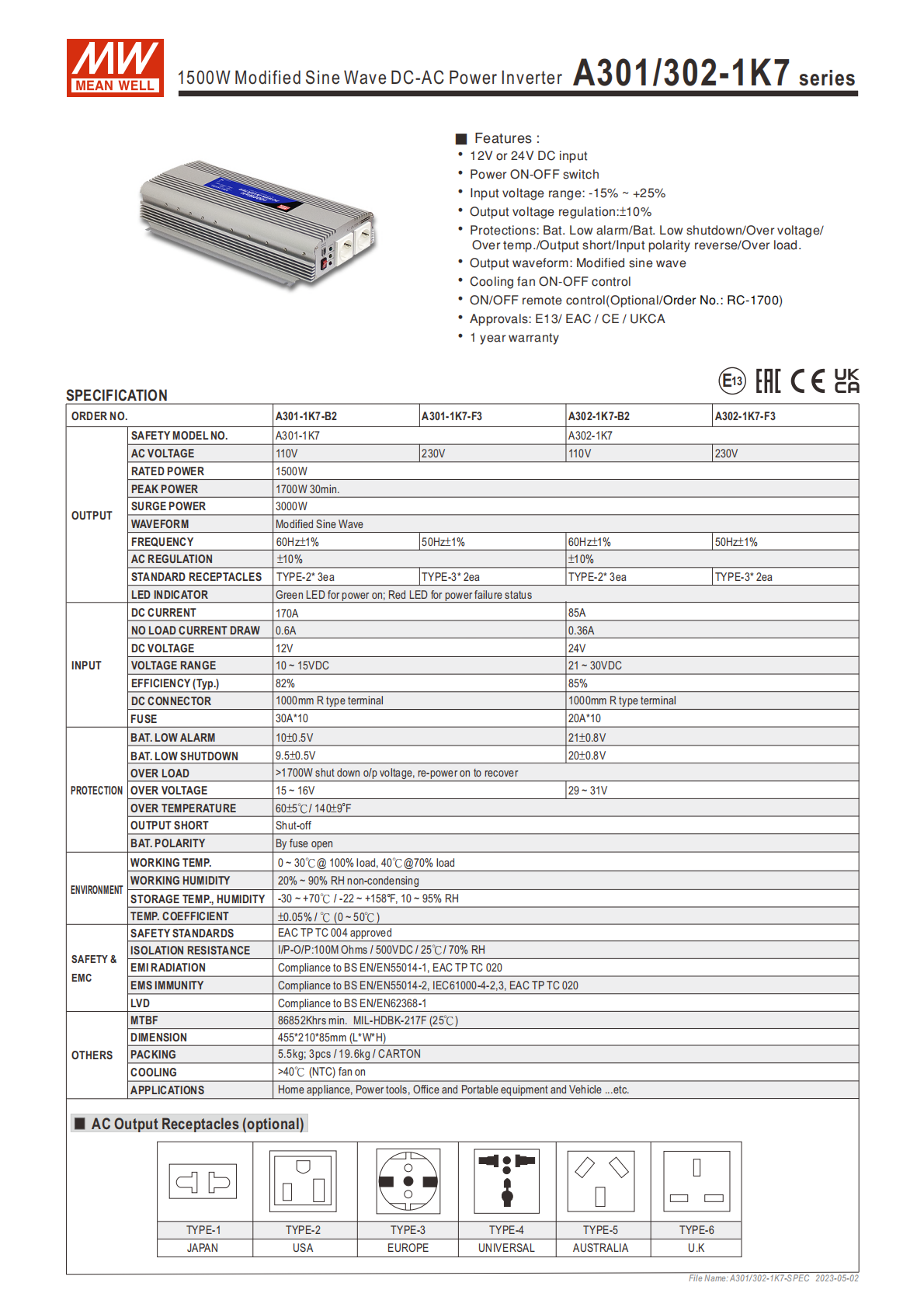 A301/302-1K7 系列為 1500W 修正正弦波 DC-AC 逆變器,支持12V/24V 直流輸入,交流輸出分110V/230V規(guī)格,額定功率 1500W、30 分鐘最大功率 1700W、浪涌功率 3000W,具備多重保護(hù)功能與開(kāi)關(guān)控制冷卻風(fēng)扇,擁有 E13/EAC/CE/UKCA 等認(rèn)證,1 年保固,適配家用、車(chē)載、船舶等多場(chǎng)景,機(jī)身尺寸45521085mm,還可選配開(kāi) / 關(guān)遙控(訂購(gòu)編碼 RC-1700)與多種規(guī)格交流輸出插座。