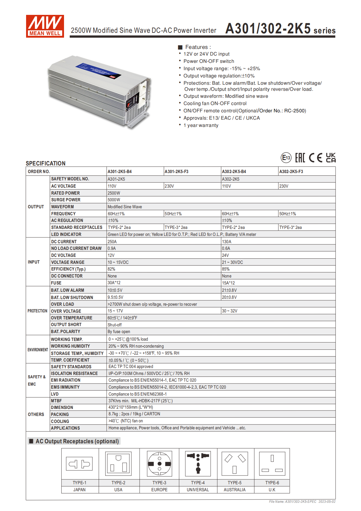 本文檔為明緯 A-301/302-2K5 系列 2500W 修正正弦波 DC-AC 逆變器的技術(shù)規(guī)格說(shuō)明,涵蓋產(chǎn)品核心特性、電氣規(guī)格、保護(hù)機(jī)制、環(huán)境參數(shù)、安規(guī)認(rèn)證、物理包裝及應(yīng)用場(chǎng)景等全維度信息,以下為分點(diǎn)詳細(xì)總結(jié):