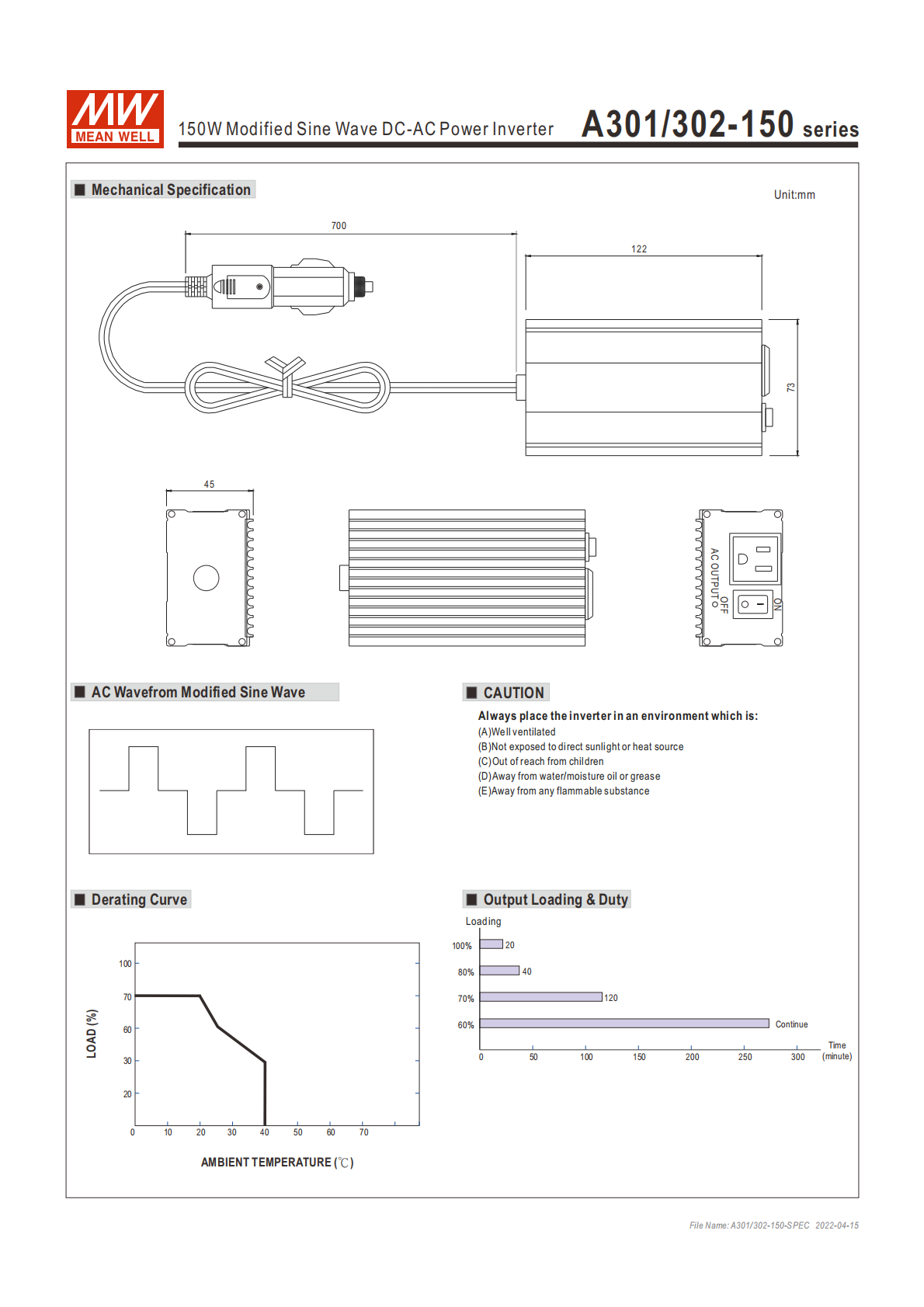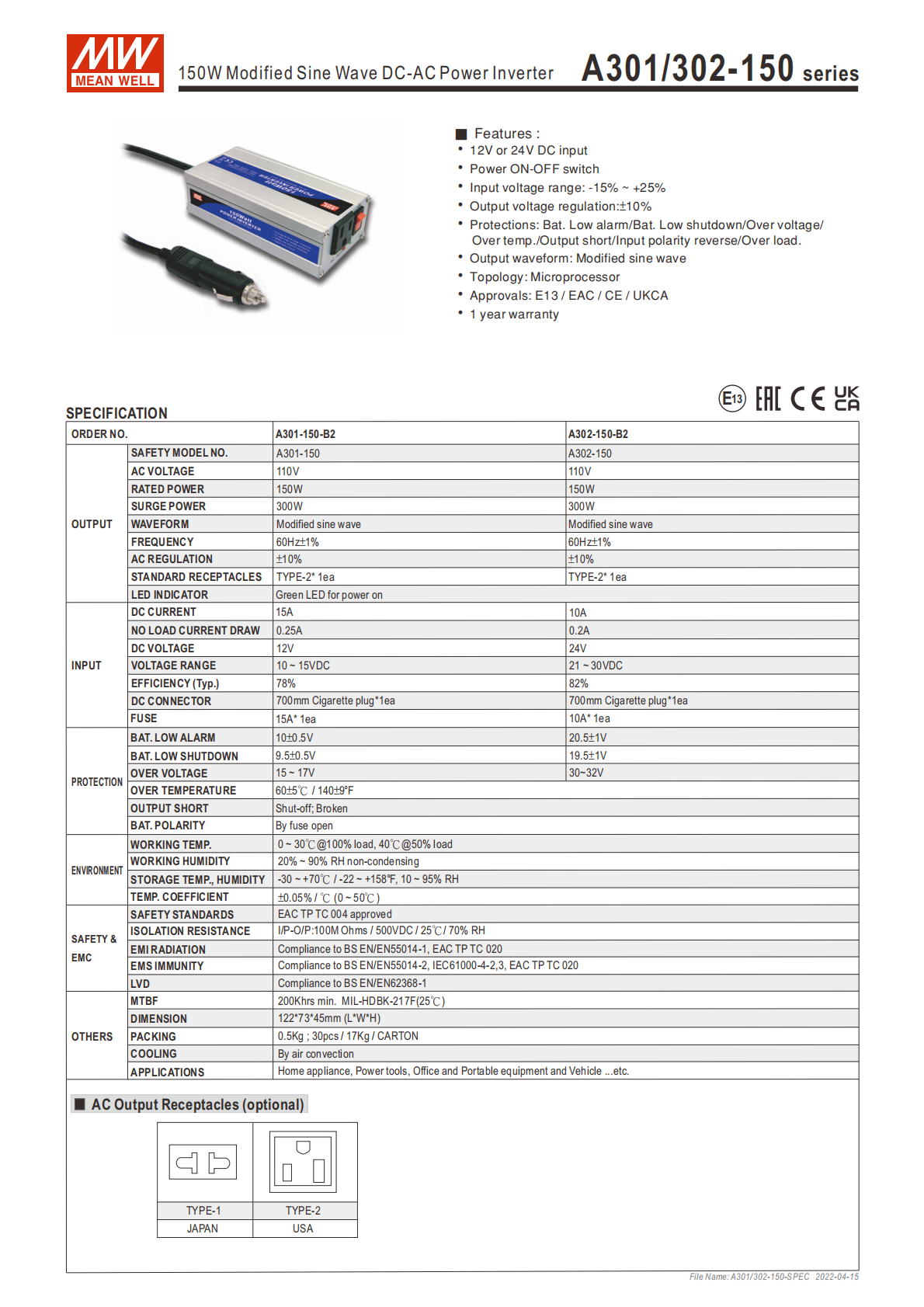 A-301/302-150 系列 150W 修正正弦波 DC-AC 逆變器分110V(B2 型號)和230V(F3 型號)兩款,分別適配12V/24V 直流輸入,額定功率 150W、浪涌功率 300W,采用微處理器控制和自然風(fēng)冷,具備7 重保護(電池低壓警報 / 關(guān)閉、過壓 / 過溫 / 短路 / 反極性 / 過載),獲e13/CE認證且 1 年保固,適配家庭、車載、船舶等多場景,不同型號在插座類型、尺寸、空載電流等參數(shù)上有差異,且輸出負載需隨環(huán)境溫度做減額處理。