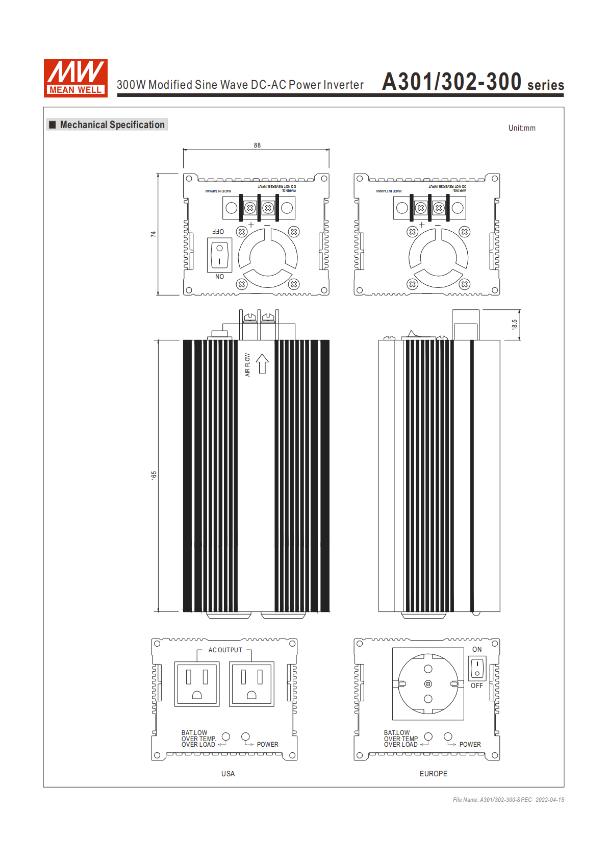A301/302-300 系列 300W 修正正弦波 DC-AC 逆變器 分 12V 直流輸入的 A301-300 和 24V 直流輸入的 A302-300 兩類,各有 110V/60Hz、230V/50Hz 交流輸出版本,額定功率 300W、浪涌功率 600W,具備電池低壓警報(bào) / 關(guān)閉、過壓 / 過溫 / 短路 / 反極性 / 過載等多重保護(hù),搭載微處理器拓?fù)渑c開關(guān)控制冷卻風(fēng)扇,通過E13/EAC/CE/UKCA等認(rèn)證,MTBF≥200Khrs,尺寸為 165*88*74mm,適用于家庭、車輛、船舶等多場(chǎng)景,提供 1 年保固。