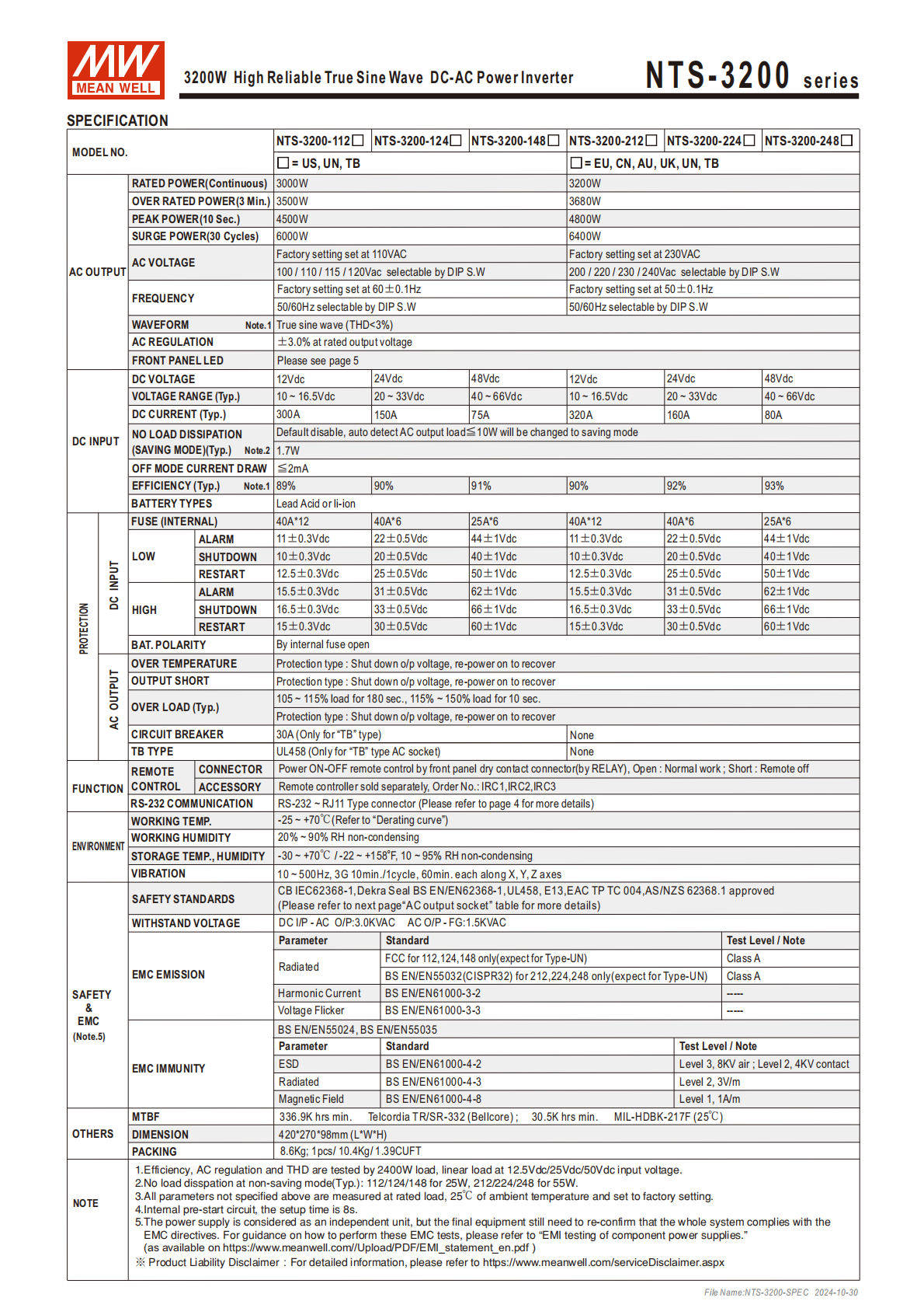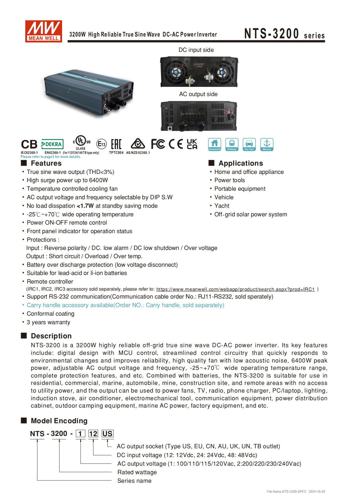NTS-3200 系列是明緯推出的3200W 高信賴離網(wǎng)純正弦波 DC-AC 逆變器,具備6400W 峰值功率、THD<3% 的純正弦波輸出,支持 12/24/48Vdc 直流輸入、多檔位交流輸出電壓 / 頻率可調(diào),工作溫度覆蓋 **-25℃~+70℃,擁有電池過放 / 反接、過溫、短路、過載等完整保護(hù)功能,適配鉛酸 / 鋰離子電池,支持 RS-232 通訊、遙控開關(guān),待機(jī)空載消耗≤1.7W**,提供3 年保固,廣泛應(yīng)用于家居辦公、車輛、游艇、離網(wǎng)太陽能發(fā)電系統(tǒng)等場(chǎng)景,還有多種插座類型、選配配件滿足不同使用需求。