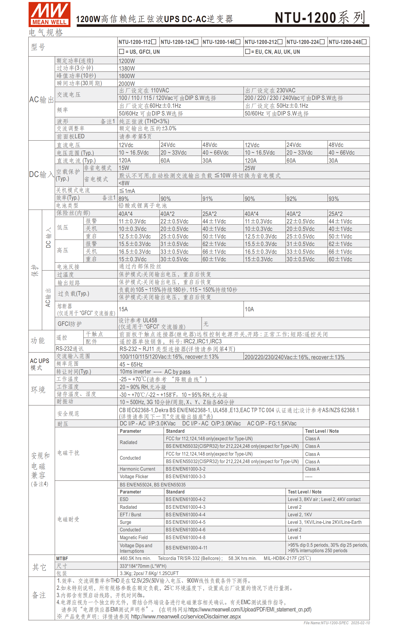 該系列按直流輸入電壓、交流輸出電壓、插座類型分 6 個(gè)核心型號(hào):NTU-1200-112/124/148/212/224/248,插座類型覆蓋多國標(biāo),現(xiàn)貨 / 選購屬性不同,具體如下: