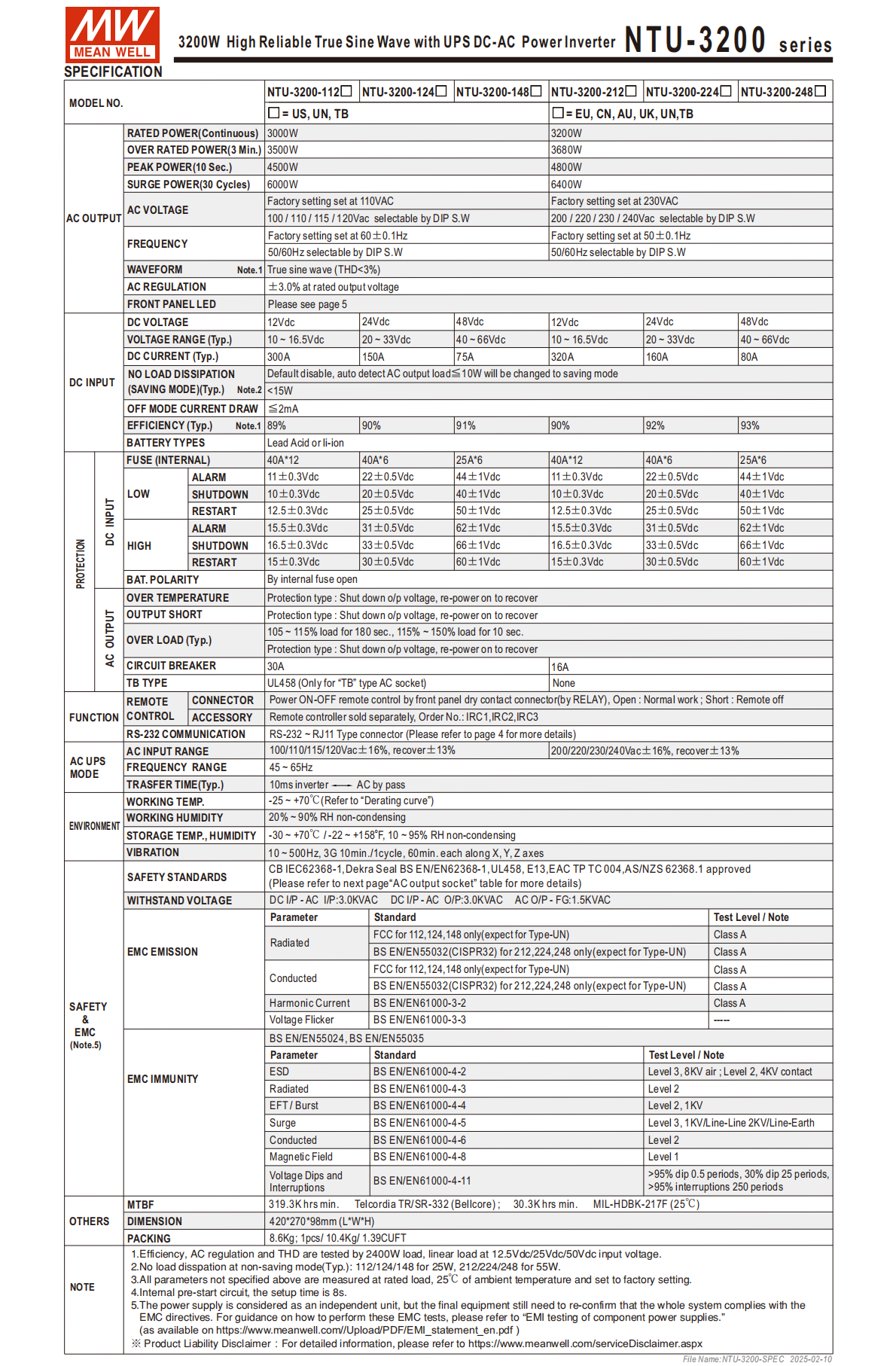 型號(hào)編碼規(guī)則:NTU-3200-「交流輸出電壓檔」「直流輸入電壓」「插座類型」,如 NTU-3200-112US 為 1 檔交流輸出、12Vdc 輸入、US 型插座;