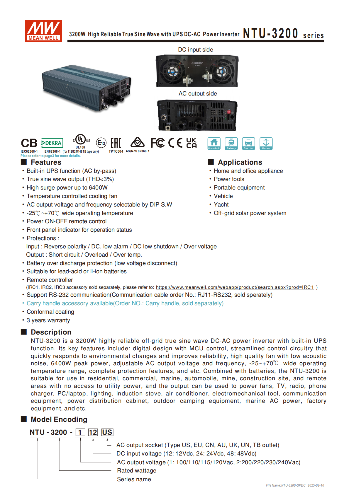 NTU-3200 系列是明緯推出的3200W 高信賴純正弦波 DC-AC 逆變器,內(nèi)置UPS 交流旁路功能,瞬間功率最高達(dá)6400W,支持12/24/48Vdc 直流輸入與100-120/200-240Vac 交流輸出(電壓 / 頻率可通過 DIP 撥碼開關(guān)調(diào)節(jié)),具備 **-25℃~+70℃寬工作溫度 **,適配鉛酸 / 鋰離子電池,擁有完善的電路保護(hù)功能,支持 RS-232 通訊、遙控開關(guān),通過多項(xiàng)國(guó)際安規(guī)認(rèn)證,提供3 年保固,廣泛應(yīng)用于家居辦公、車輛游艇、離網(wǎng)太陽(yáng)能發(fā)電等多場(chǎng)景,還可搭配 IRC 系列遙控器、RJ11-RS232 通訊線等選配配件使用。