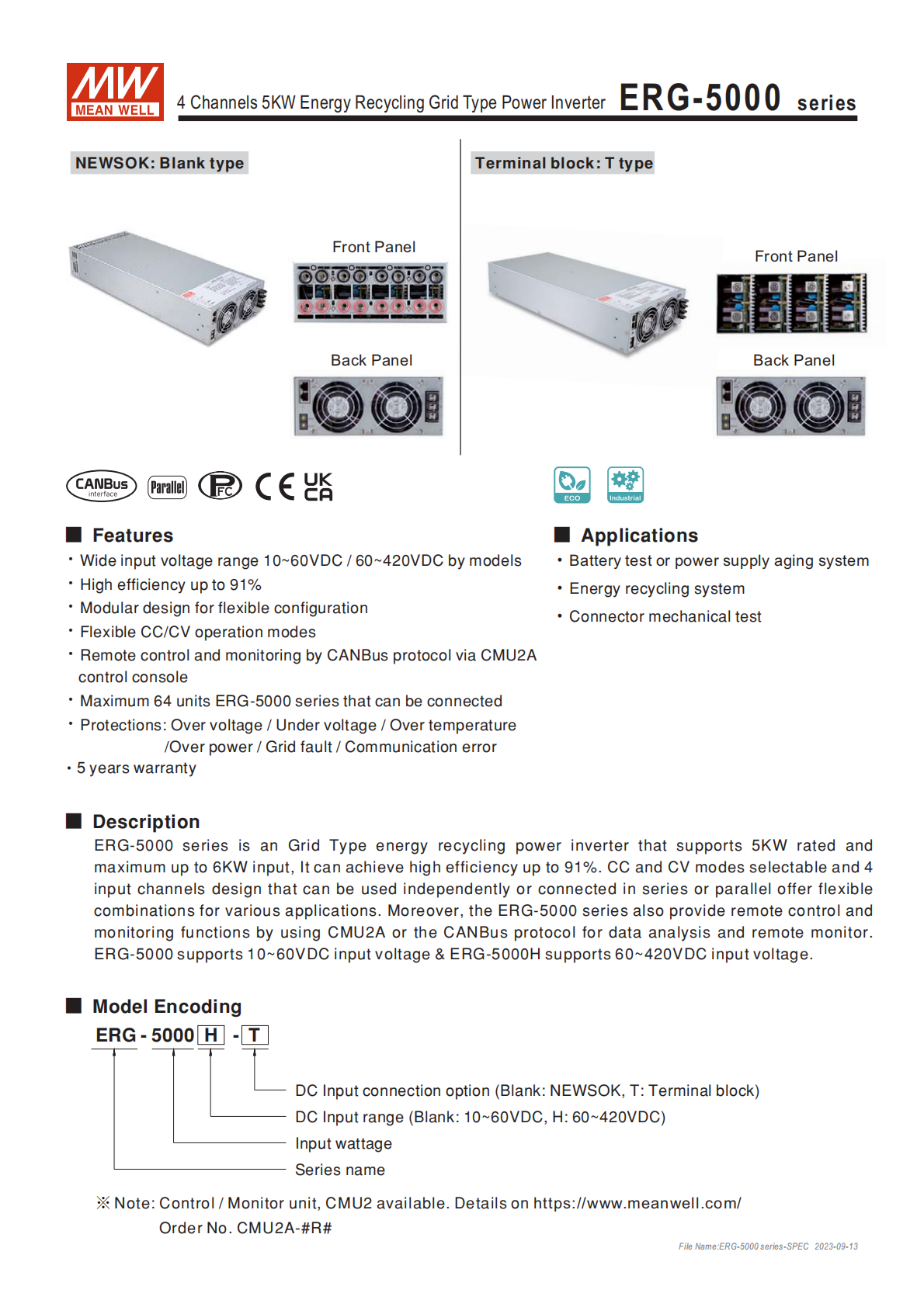 ERG-5000 系列是明緯推出的 4 通道 5KW 電網(wǎng)型能量回收逆變器,分ERG-5000(10~60VDC 輸入)和ERG-5000H(60~420VDC 輸入)兩款核心機型,額定輸入功率5KW、最大6KW,最高效率達91%,支持CC/CV雙操作模式,配備CANBus通訊界面可通過 CMU2A 遠程控制監(jiān)控,最多64 臺并聯(lián)通訊,擁有過壓 / 欠壓等多重保護,提供5 年保固,模塊化 4 通道設計可獨立 / 串聯(lián) / 并聯(lián)使用,適用于電池測試、能量回收等場景,還通過相關安規(guī)認證,MTBF 值表現(xiàn)優(yōu)異。