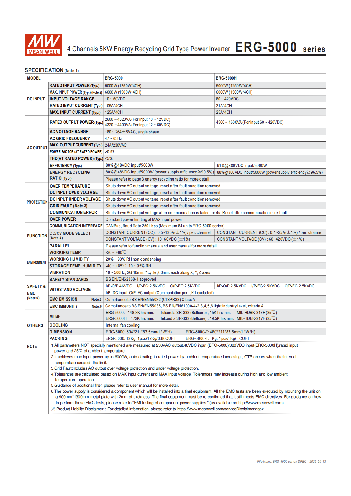 ERG-5000 系列是明緯研發(fā)的4 通道 5KW 電網(wǎng)型能量回收逆變器,核心為能量回收與靈活電力轉換,分ERG-5000和ERG-5000H兩款機型,模塊化 4 通道設計支持獨立、串聯(lián)或并聯(lián)使用,適配多種工業(yè)場景,提供5 年保固,通過BS EN/EN62368-1安規(guī)認證,電磁兼容符合相關 Class A 標準。