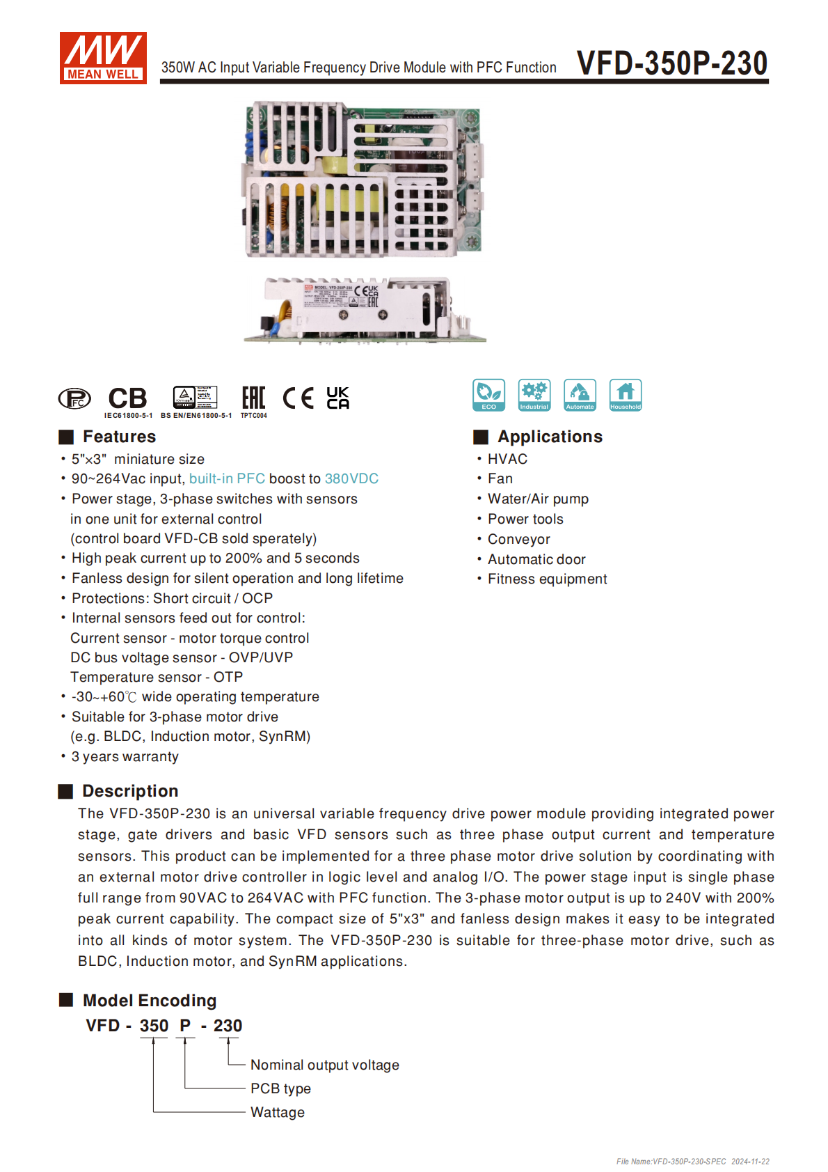 VFD-350P-230是明緯推出的350W帶 PFC 功能的交流輸入變頻驅(qū)動(dòng)電源模塊,輸入為90~264VAC 單相、直流總線電壓達(dá)380±5VDC,三相輸出最高 240V,峰值電流可達(dá)200%并持續(xù) 5 秒,采用無(wú)風(fēng)扇設(shè)計(jì),尺寸僅12776.235mm,工作溫度寬至 **-30~+60℃**,適配無(wú)刷直流、感應(yīng)、同步磁阻等三相電機(jī),集成電流、電壓、溫度等多種傳感器及短路 / 過(guò)流等保護(hù)功能,通過(guò)邏輯電平與模擬 I/O 配合外部控制器實(shí)現(xiàn)電機(jī)驅(qū)動(dòng),擁有 3 年保固,廣泛應(yīng)用于暖通空調(diào)、泵體、輸送機(jī)等場(chǎng)景,配套控制板 VFD-CB 需單獨(dú)選購(gòu)。