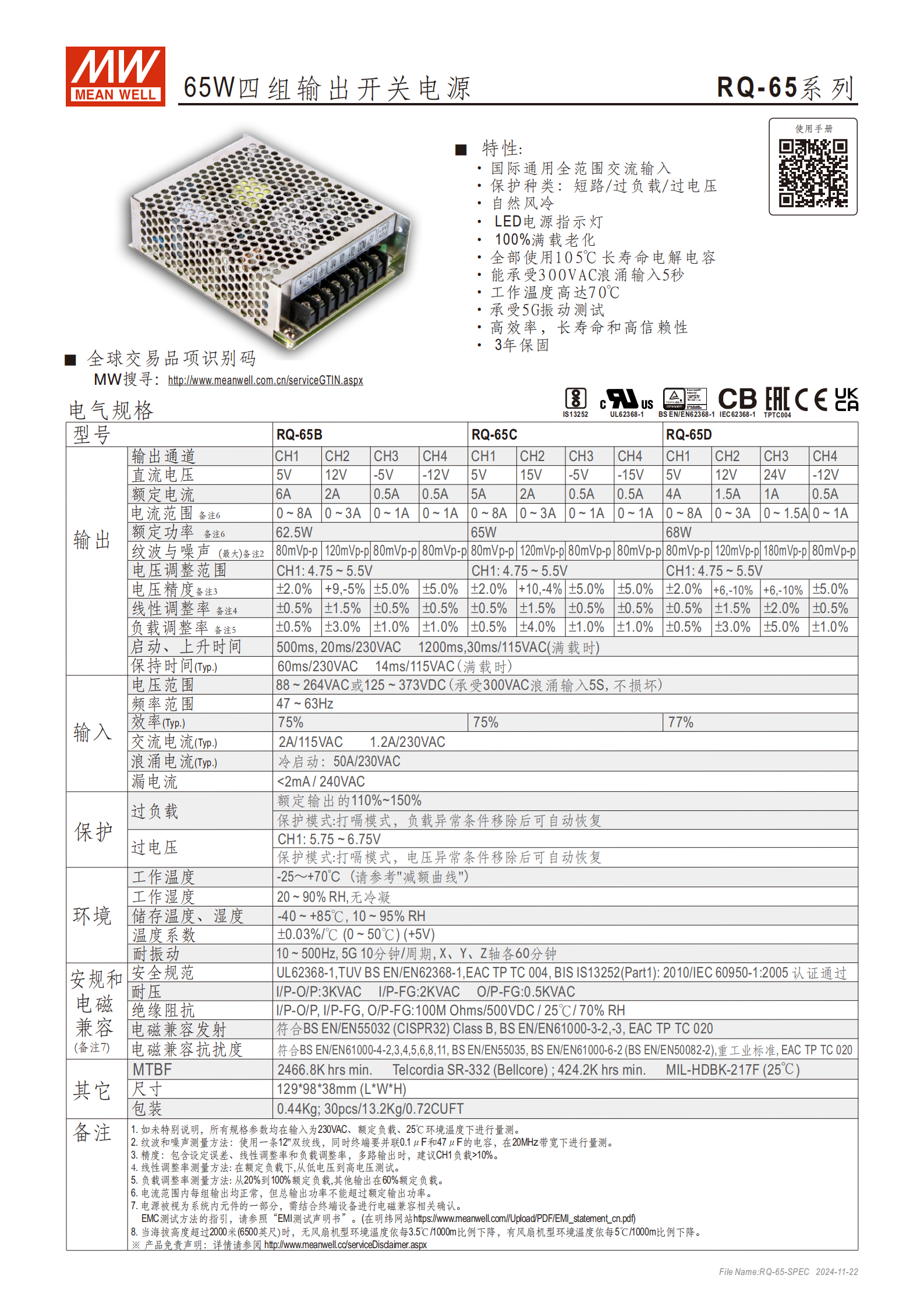 RQ-65 系列是一款65W 四組輸出開關(guān)電源,包含RQ-65B/C/D三個細(xì)分型號,核心優(yōu)勢為88~264Vac/125~373Vdc 國際通用寬電壓輸入、短路 / 過負(fù)載 / 過電壓三重保護(hù)(打嗝模式)、70℃高溫工作、5G 抗振動、105℃長壽命電解電容、3 年保固,效率達(dá)75%~77% ,能承受300Vac 浪涌輸入 5 秒,尺寸為1299838mm,輸出電壓組合覆蓋5V/12V/15V/24V/-5V/-12V/-15V,通過 UL62368-1 等多項(xiàng)國際安全認(rèn)證,適配需多路正負(fù)壓供電的電子設(shè)備與工業(yè)模塊,可靠性與適配性突出。