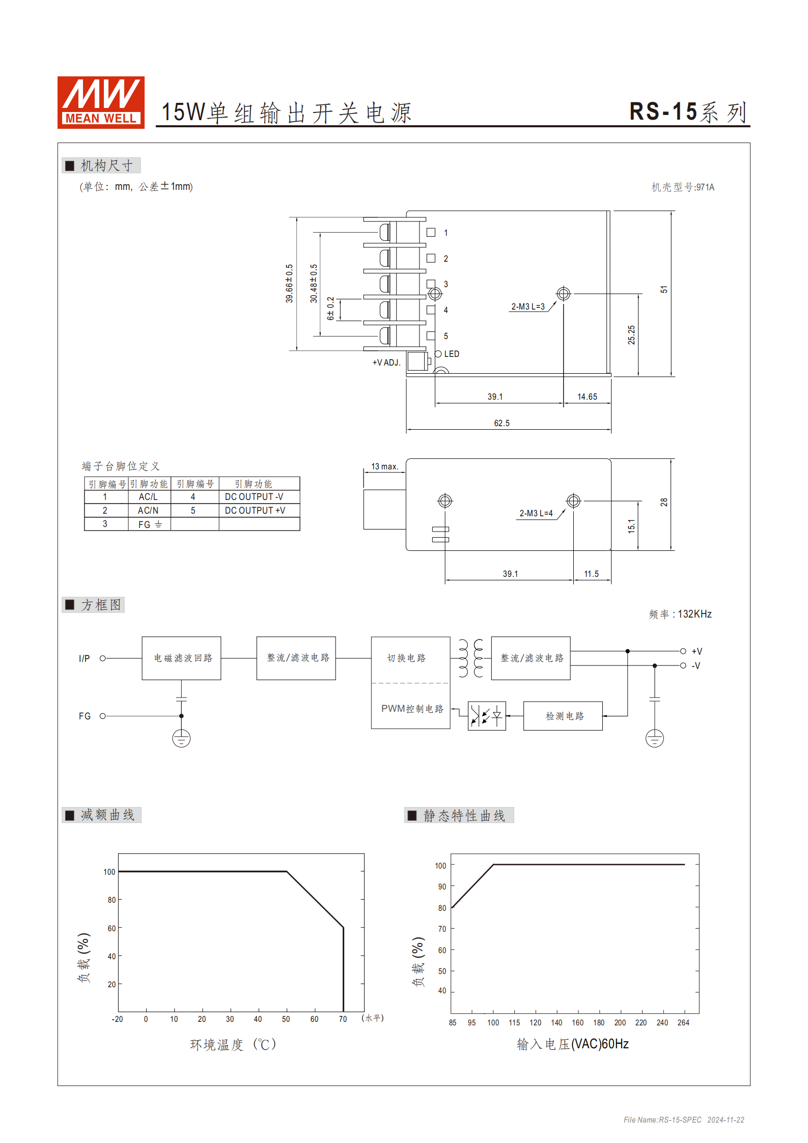 | RS-15-15 | 15V | 1A | 0~1A | 15W | 120mVp-p | 13.5~16.5V | ±1.0% |