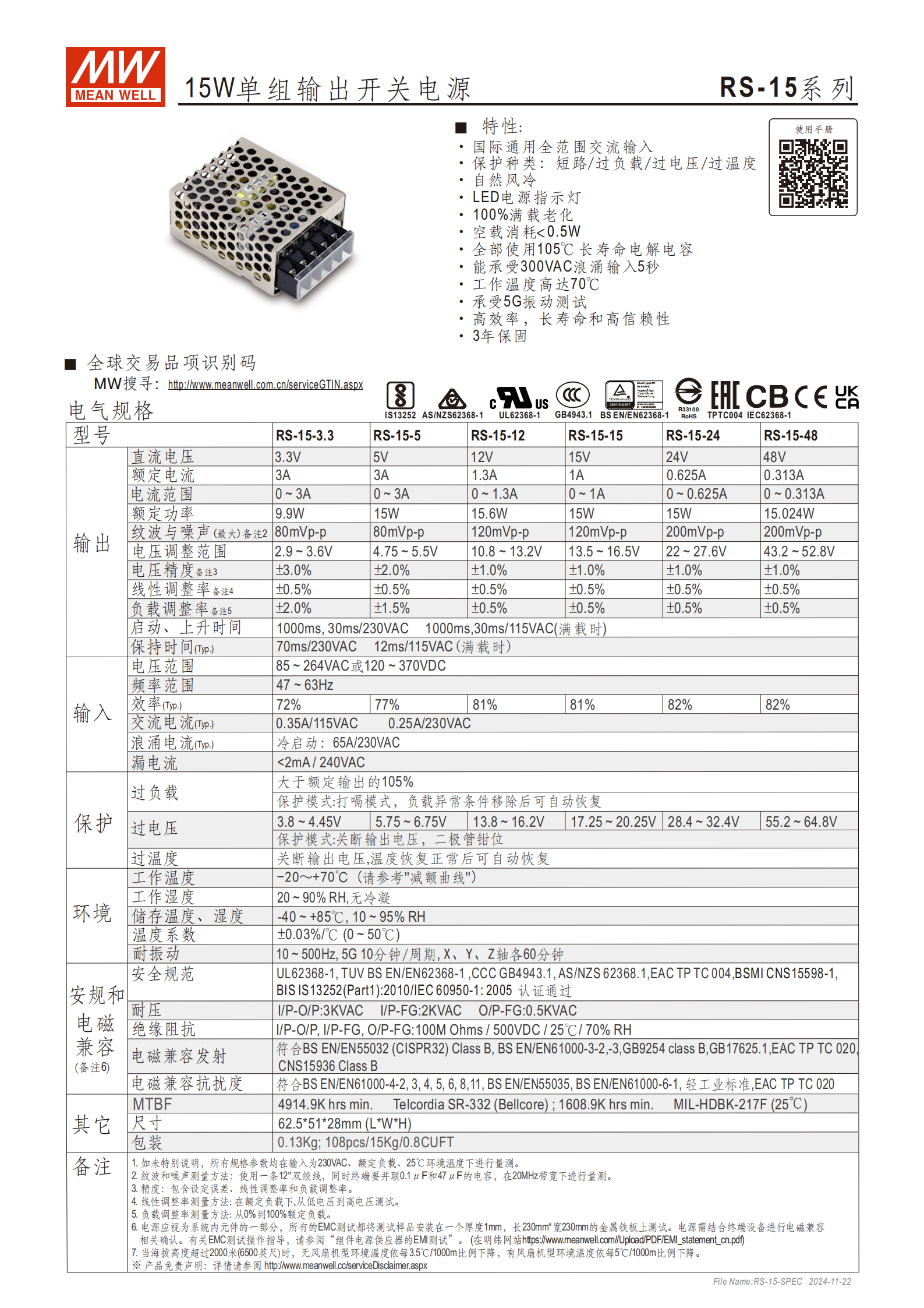 | 效率(Typ.) | 72%(RS-15-3.3)、81%(RS-15-5/15)、77%(RS-15-12)、82%(RS-15-24/48) |