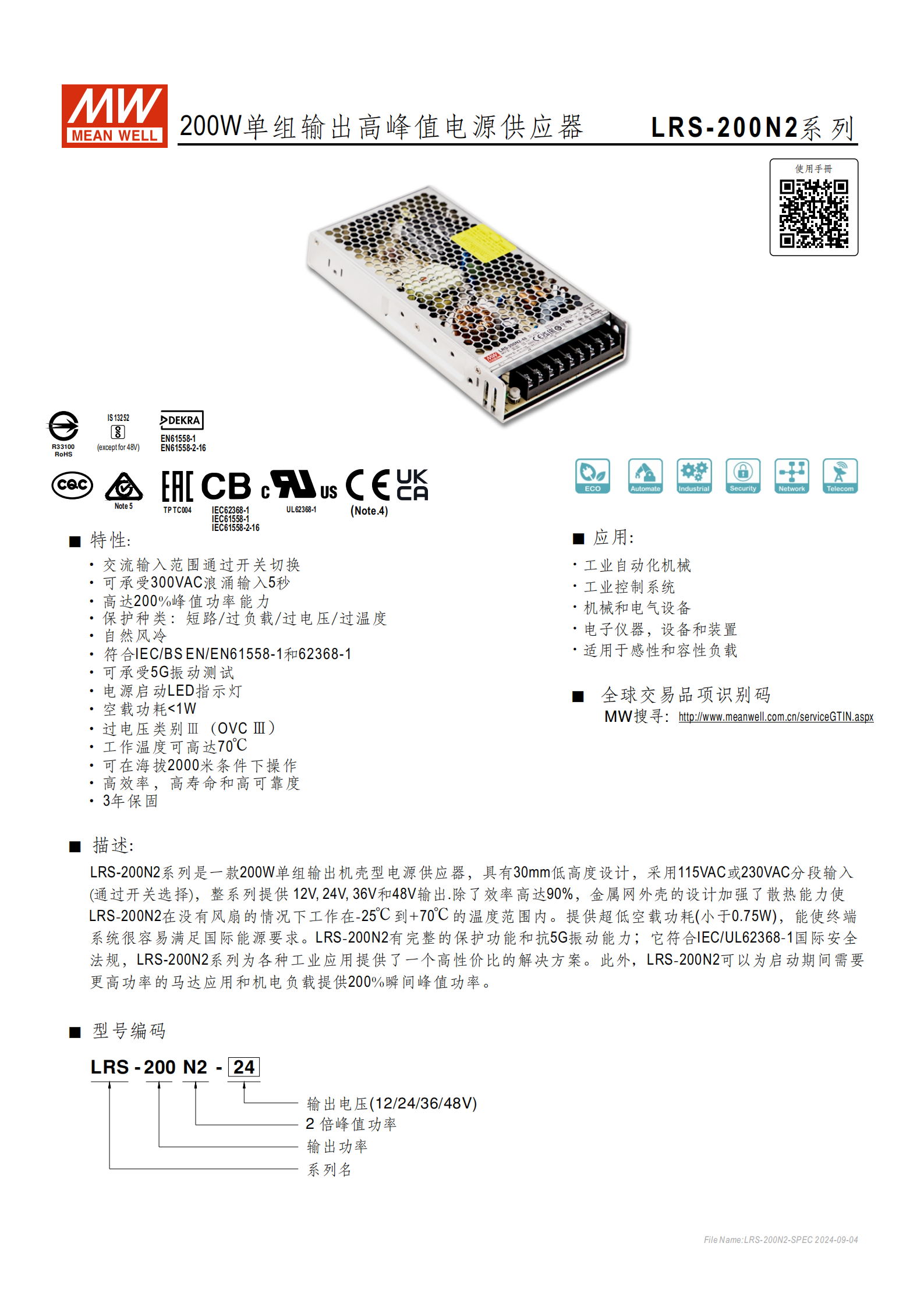品牌型號:MEAN WELL(明緯)LRS-200N2 系列