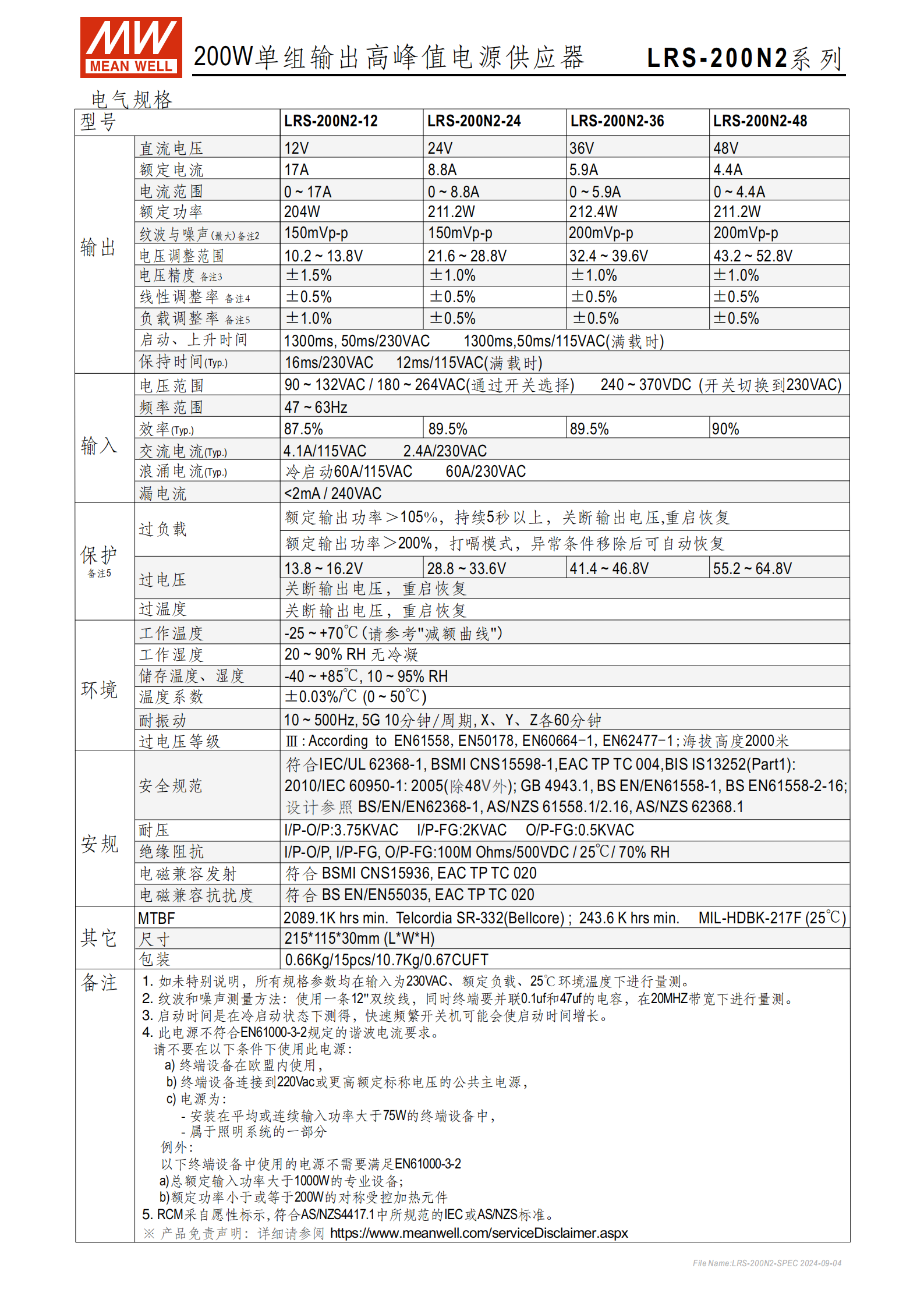 | 規(guī)格項 | LRS-200N2-12 | LRS-200N2-24 | LRS-200N2-36 | LRS-200N2-48 |