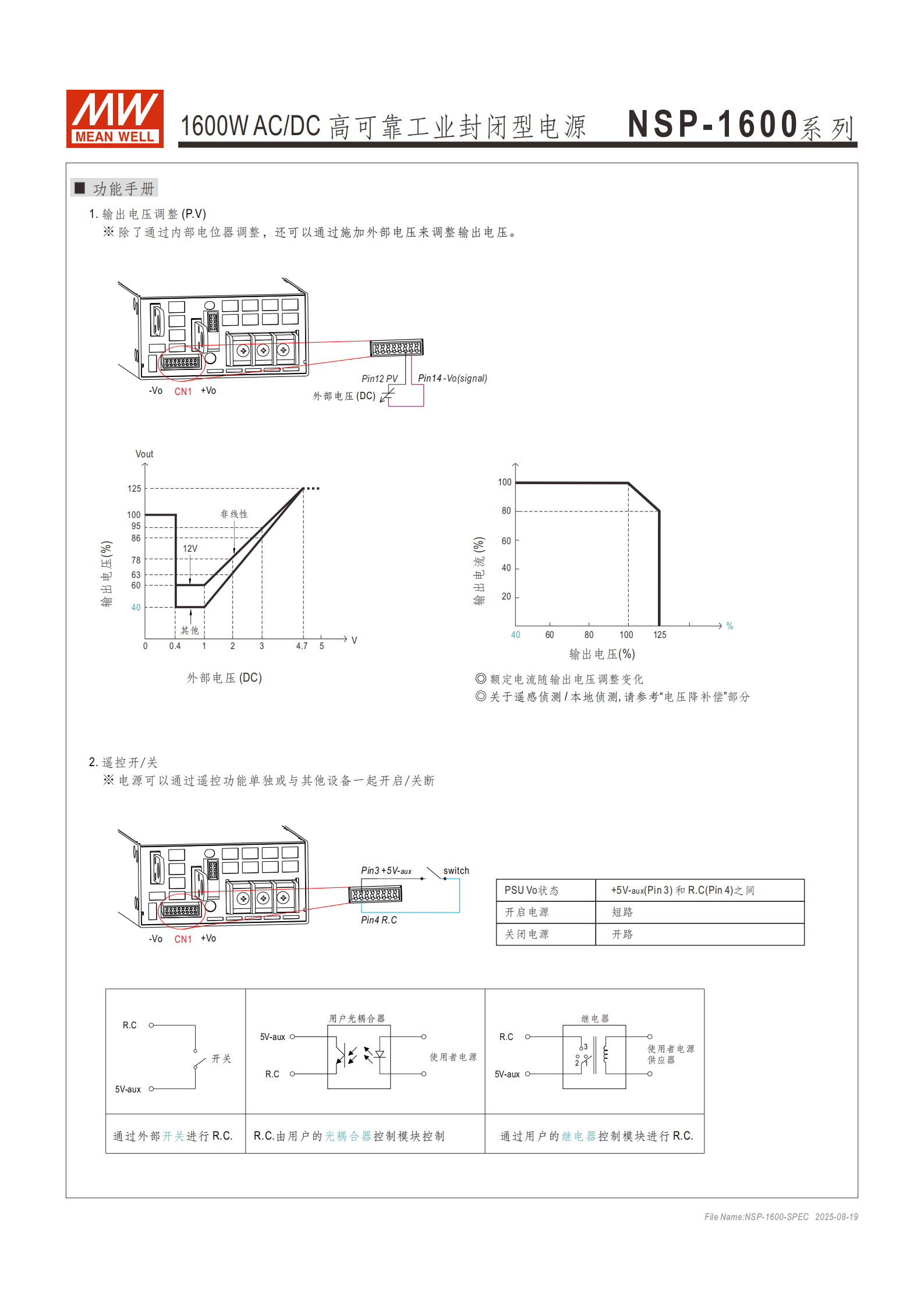遙控開關(guān):通過電信號或干接點控制(Pin4 R.C 與 Pin3 +5V-aux 短路開啟,開路關(guān)閉),隔離信號(參考 GND-aux)