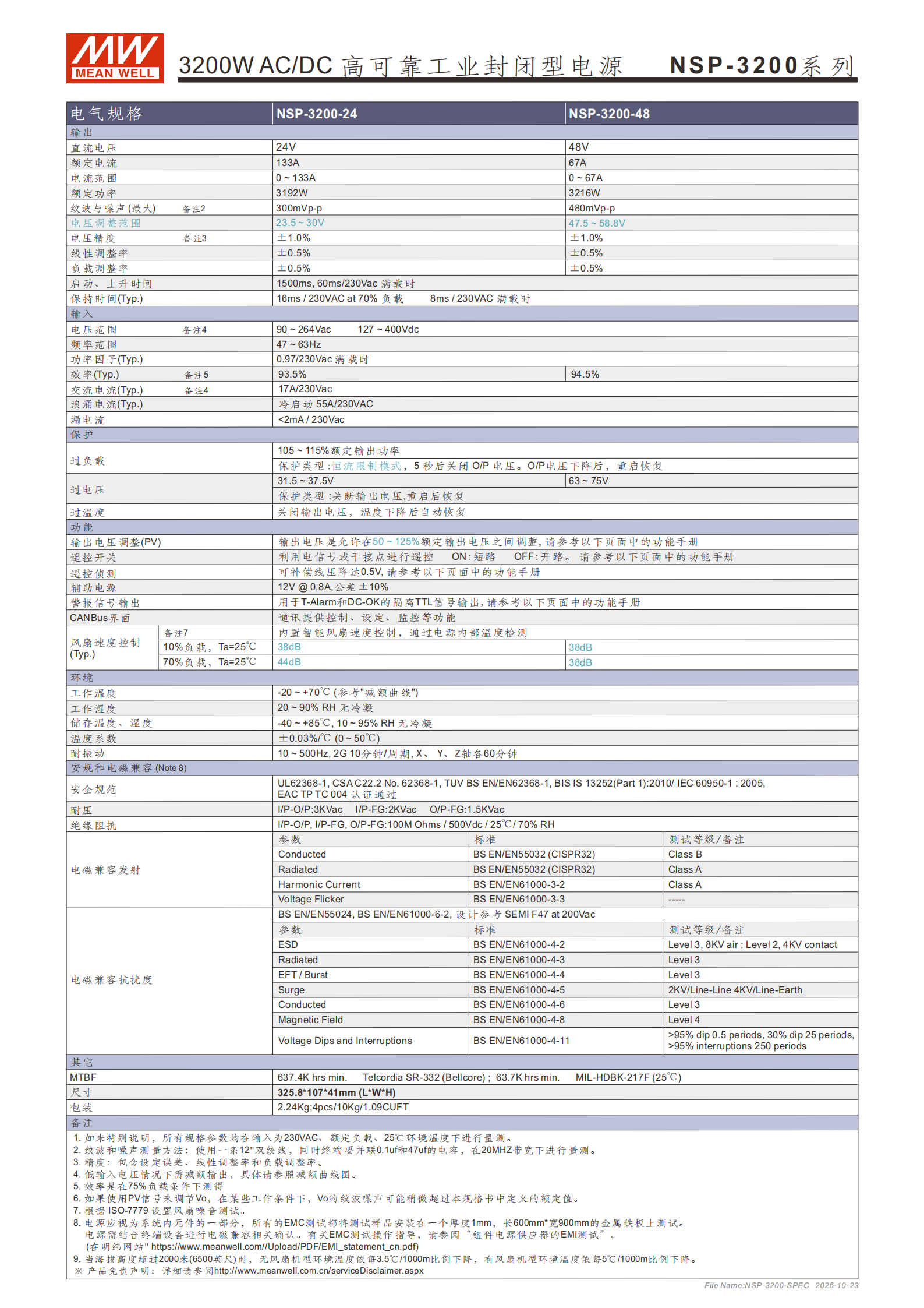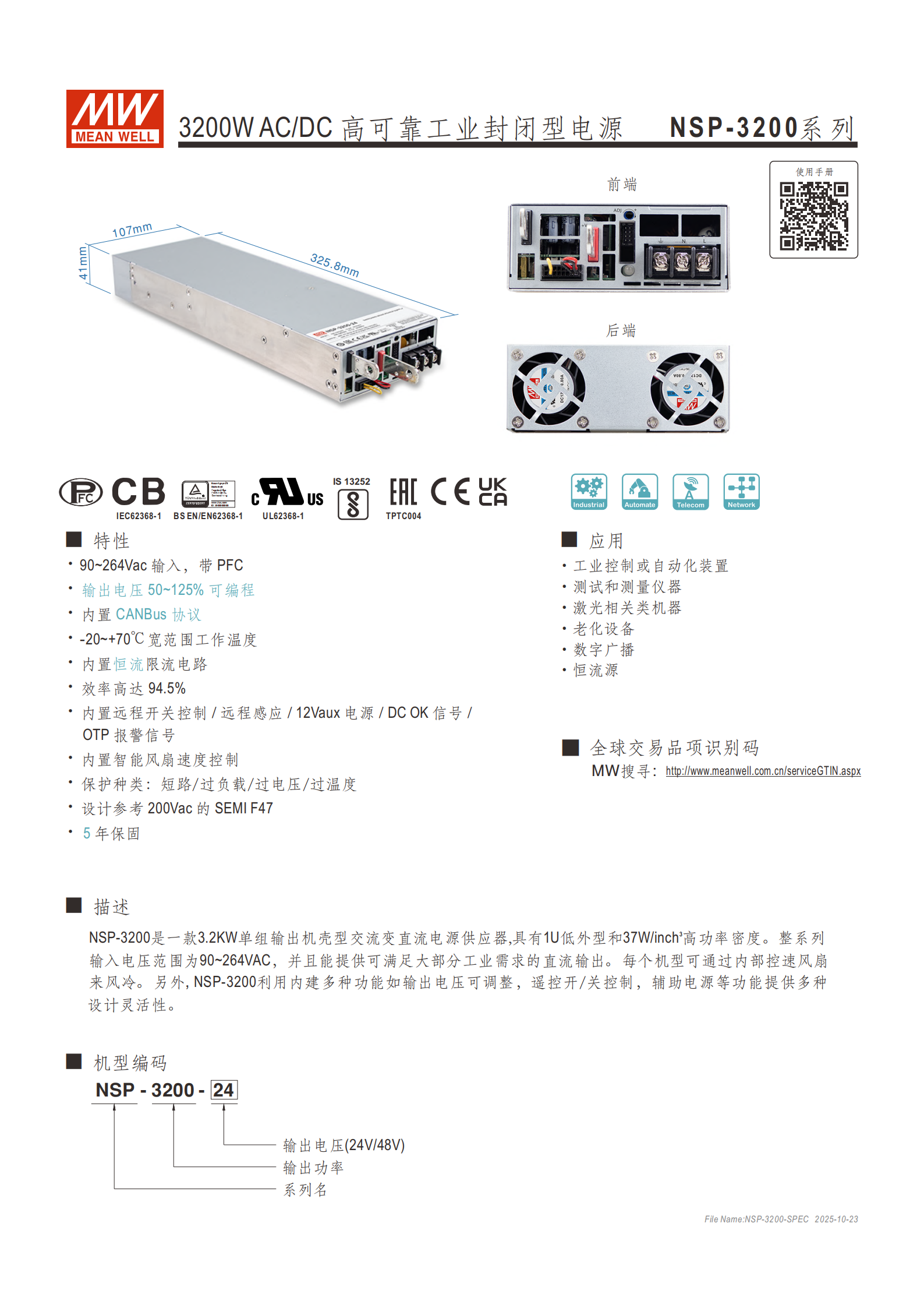 NSP-3200 系列是一款 3.2KW 單組輸出機(jī)殼型 AC/DC 高可靠工業(yè)封閉型電源,具備1U 低外型和37W/inch 高功率密度,輸入電壓范圍為90~264Vac(支持 127~400Vdc),輸出電壓分 24V(133A)和 48V(67A)兩種規(guī)格,可在50~125% 額定電壓間可編程調(diào)整,效率高達(dá)94.5% ,工作溫度范圍為 **-20~+70℃** ,內(nèi)置 CANBus 協(xié)議、智能風(fēng)扇調(diào)速、多種保護(hù)功能(短路 / 過負(fù)載 / 過電壓 / 過溫度)及遙控開關(guān)、遠(yuǎn)程感應(yīng)等實(shí)用功能,符合多項(xiàng)國際安規(guī)認(rèn)證,適用于工業(yè)控制、測試測量儀器等場景,提供5 年保固。