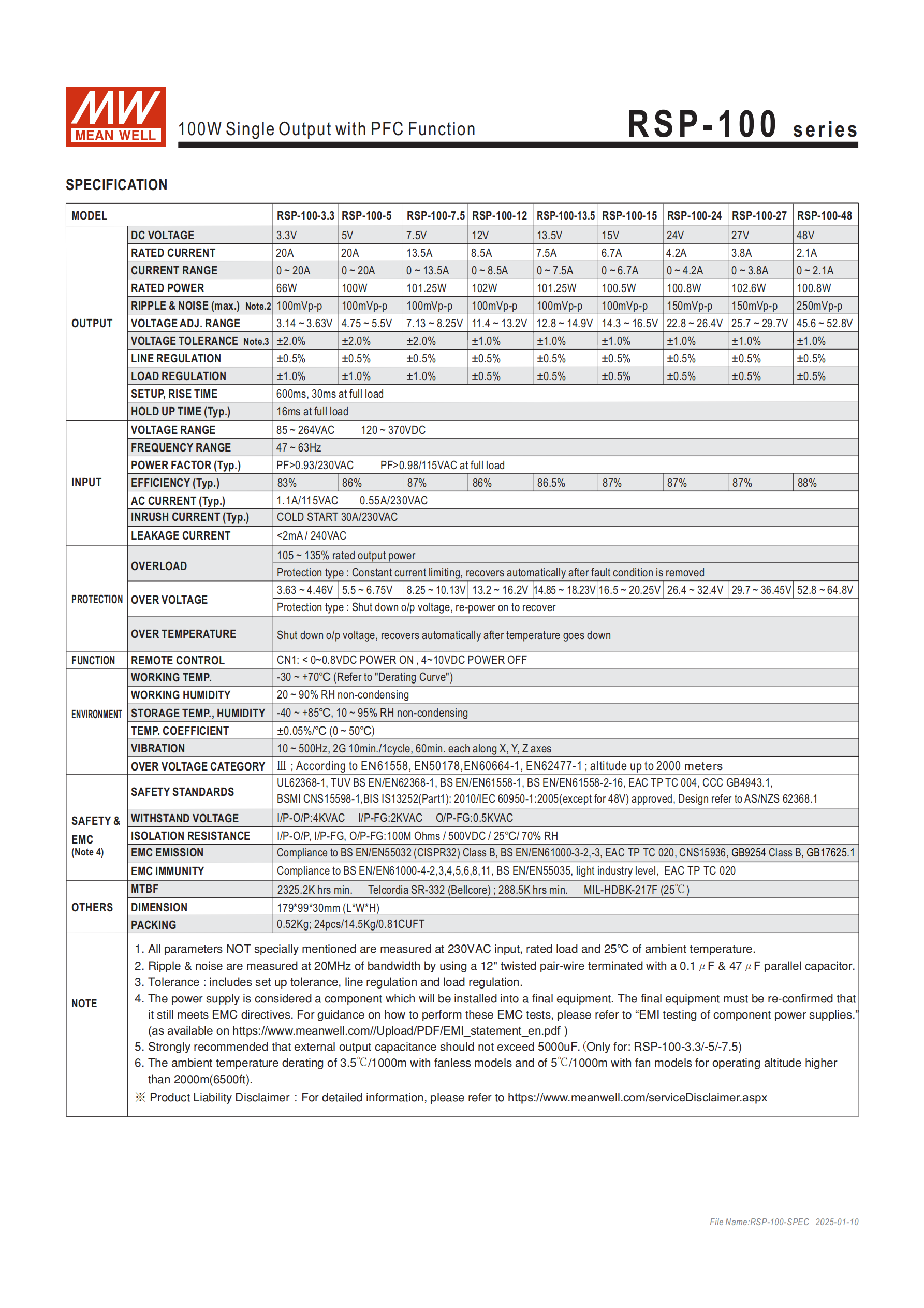 | 項(xiàng)目 | RSP-75 系列 | RSP-100 系列 |