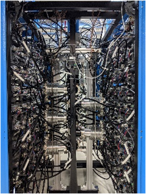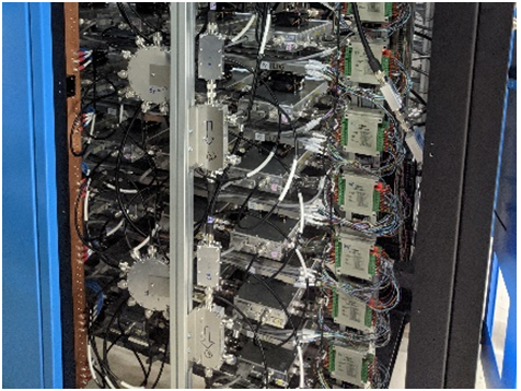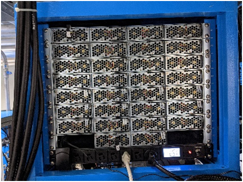 該標(biāo)案規(guī)劃使用多套96kW之高功率電源系統(tǒng)(圖三),使用電源系統(tǒng)輸出的電力驅(qū)動(dòng)全固態(tài)射頻功率放大器(Radio Frequency Power Amplifier)叢集(圖四)產(chǎn)生高頻能量,匯集高頻能量供應(yīng)電子于趨近光速運(yùn)行所需之能量(圖五),全部電源系統(tǒng)最大輸出直流功率將近800kW !