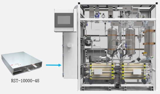 3 如下將RST-10000-48安裝在電解水制氫設(shè)備系統(tǒng)內(nèi),作為電解槽中電極的直流供電用,水分子在直流電流的作用下發(fā)生電化學(xué)反應(yīng)分解產(chǎn)生氫氣。氫氣的產(chǎn)量決定電源的功率。