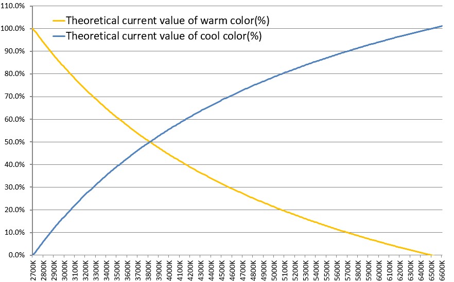 可調(diào)色溫和亮度的LED燈具,內(nèi)部是采用了冷、暖色溫兩路光源輸出,如下圖三,一路為冷光(6500K),一路為暖光(2700K),每一路相對獨立。如下圖四,透過調(diào)設(shè)每一路光源驅(qū)動電流的比例,可以實現(xiàn)色溫調(diào)設(shè);在一定色溫條件下,同比例改變兩路光源驅(qū)動電流的大小,可以實現(xiàn)亮度調(diào)設(shè)。