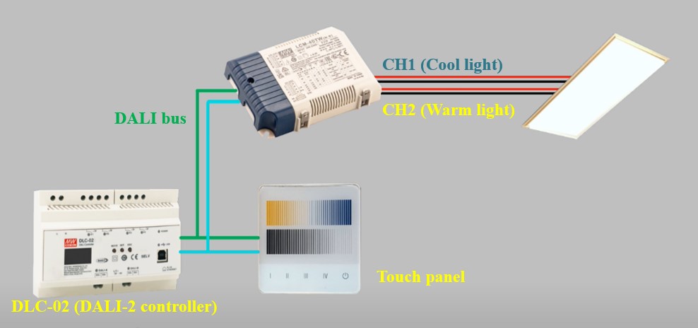 為滿足市場應(yīng)用需求,明緯最新推出一款符合DALI-2的LCM-40TW可調(diào)色溫和亮度的智能電源,結(jié)合明緯DLC-02 DALI-2控制器,搭配DALI-2輸入設(shè)備(如觸摸面板、存在傳感器等),為室內(nèi)智能照明系統(tǒng)提供最佳解決方案,如下圖五為DALI-2智能照明配置圖。
