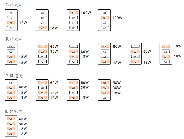 支持 PD(Power Delivery) 3.0 和 QC (Quick Charge)2.0、3.0 等主流快充協(xié)議,可滿足包括筆記本電腦、平板計(jì)算機(jī)、智能手機(jī)等多種設(shè)備的高效充電需求。下圖詳細(xì)說明了不同數(shù)量接口充電時(shí)各接口支持的最大功率: