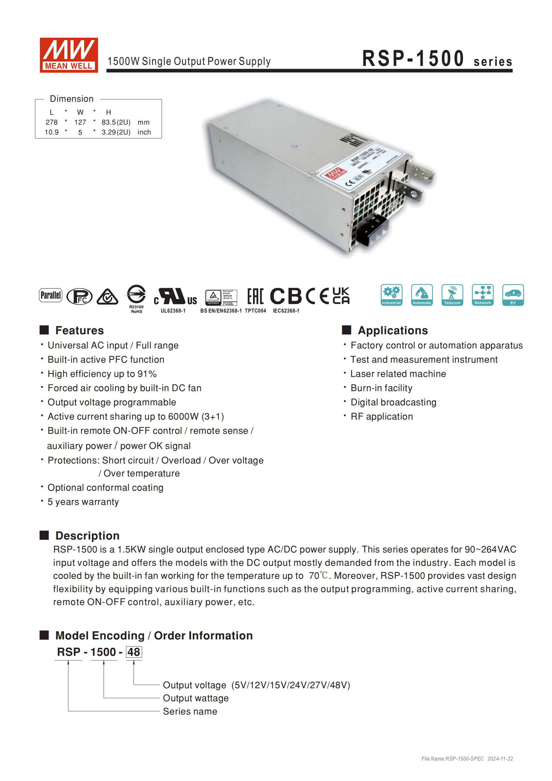 | RSP-1500-24 | 24V | 63A | 1512W | 20~26.4V | 150mVp-p |