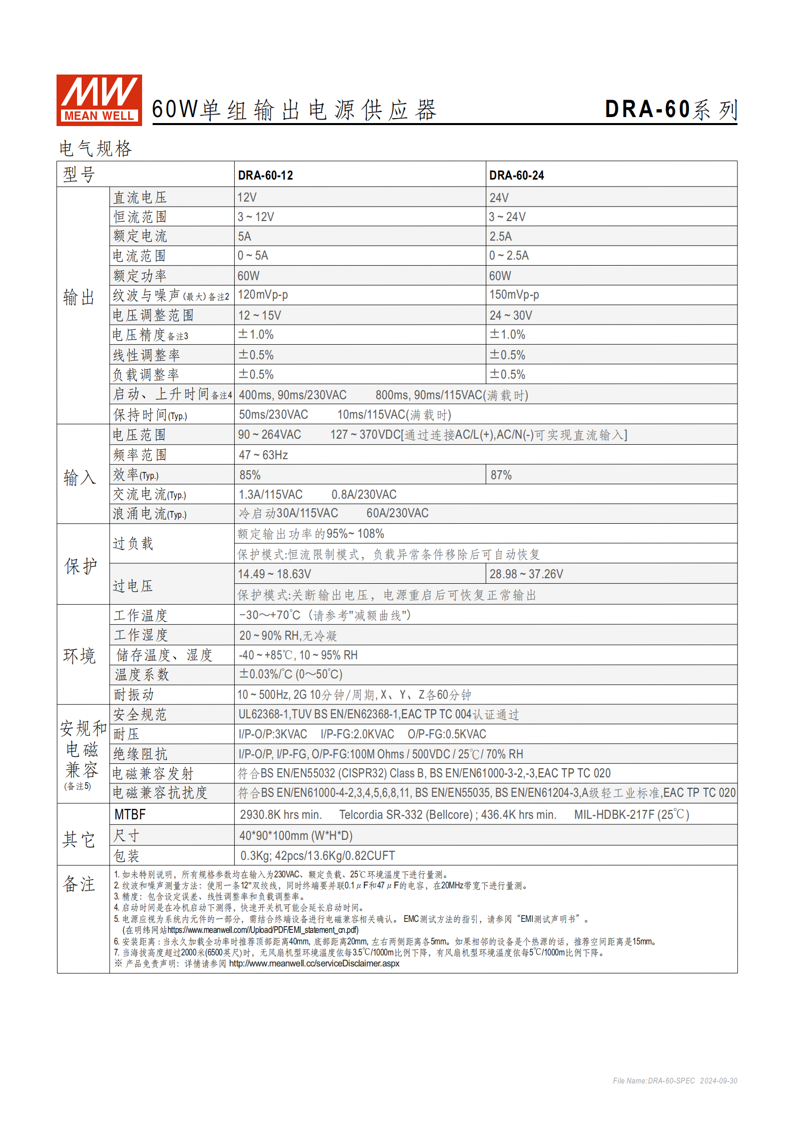 DRA-60-24:輸出直流電壓 24V(可調(diào)整至 24~30V),額定電流 2.5A,電流范圍 0~2.5A,恒流范圍 3~24V,最大紋波與噪聲 150mVp-p;
