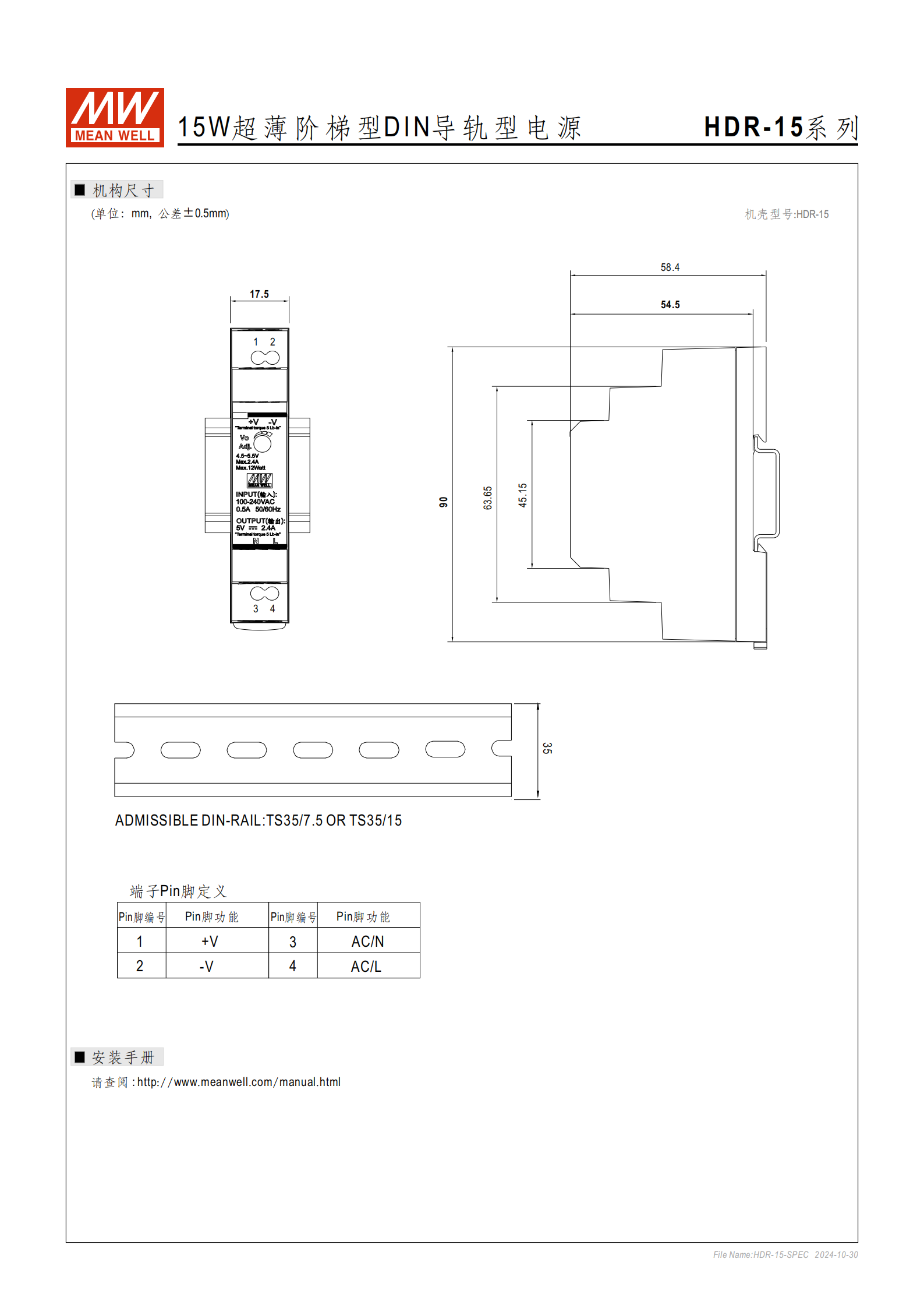 | HDR-15-5 | 5V | 2.4A | 4.5~5.5V |