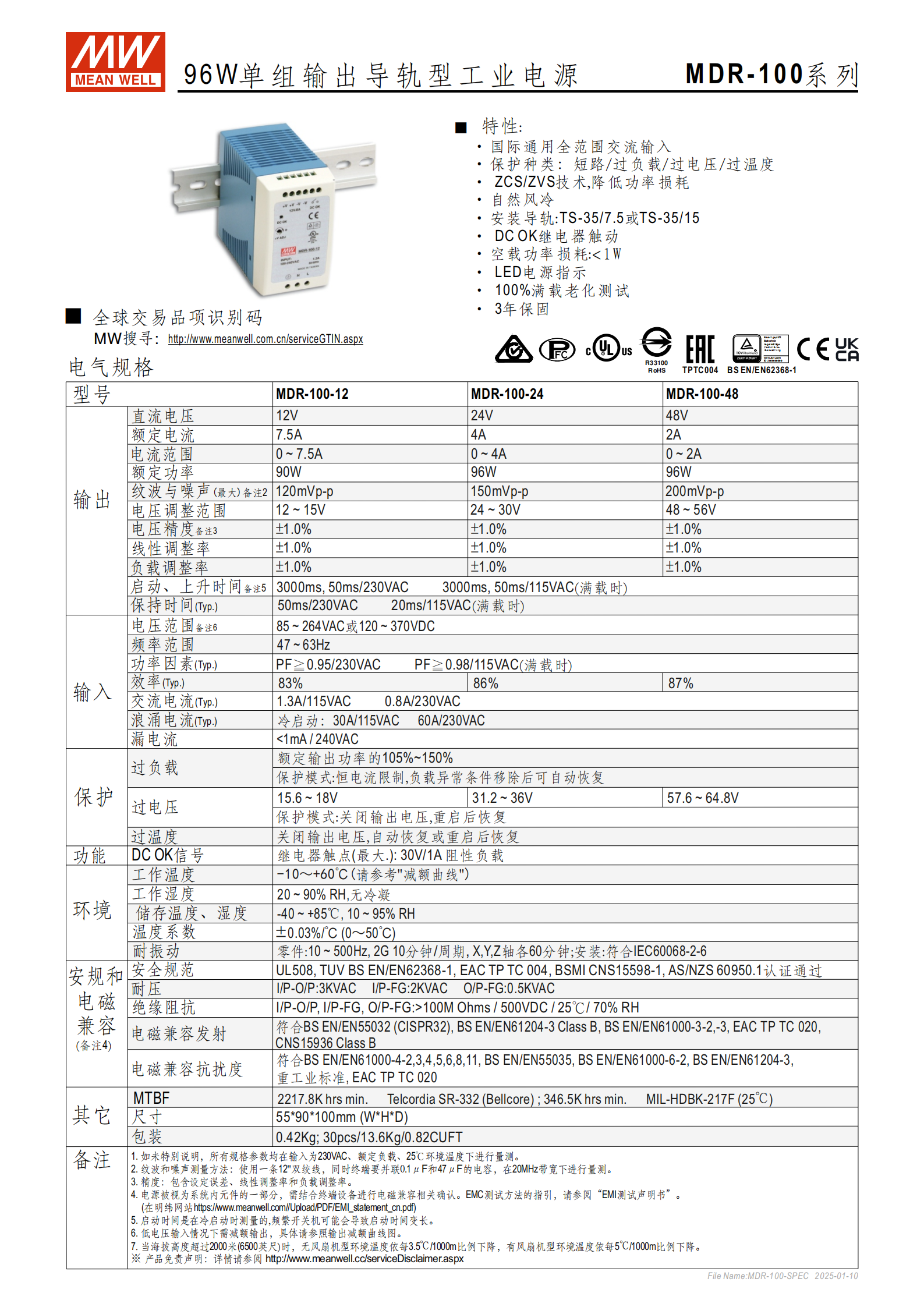 MDR-100 系列是 96W 單組輸出導(dǎo)軌型工業(yè)電源,具備國際通用全范圍交流輸入、短路 / 過負(fù)載 / 過電壓 / 過溫度多重保護(hù),采用 ZCS/ZVS 技術(shù)及自然風(fēng)冷設(shè)計,支持 TS-35/7.5 或 TS-35/15 導(dǎo)軌安裝,空載功率損耗 < 1W,LED 電源指示、DC OK 繼電器觸動功能齊全,經(jīng)過 100% 滿載老化測試且提供 3 年保固;輸出涵蓋 12V、24V、48V 三種規(guī)格,額定功率最高 96W,電壓精度 ±1.0%,工作溫度范圍 - 10~+60℃,符合多項國際安規(guī)與電磁兼容標(biāo)準(zhǔn),MTBF 值最高達(dá) 2217.8K hrs。