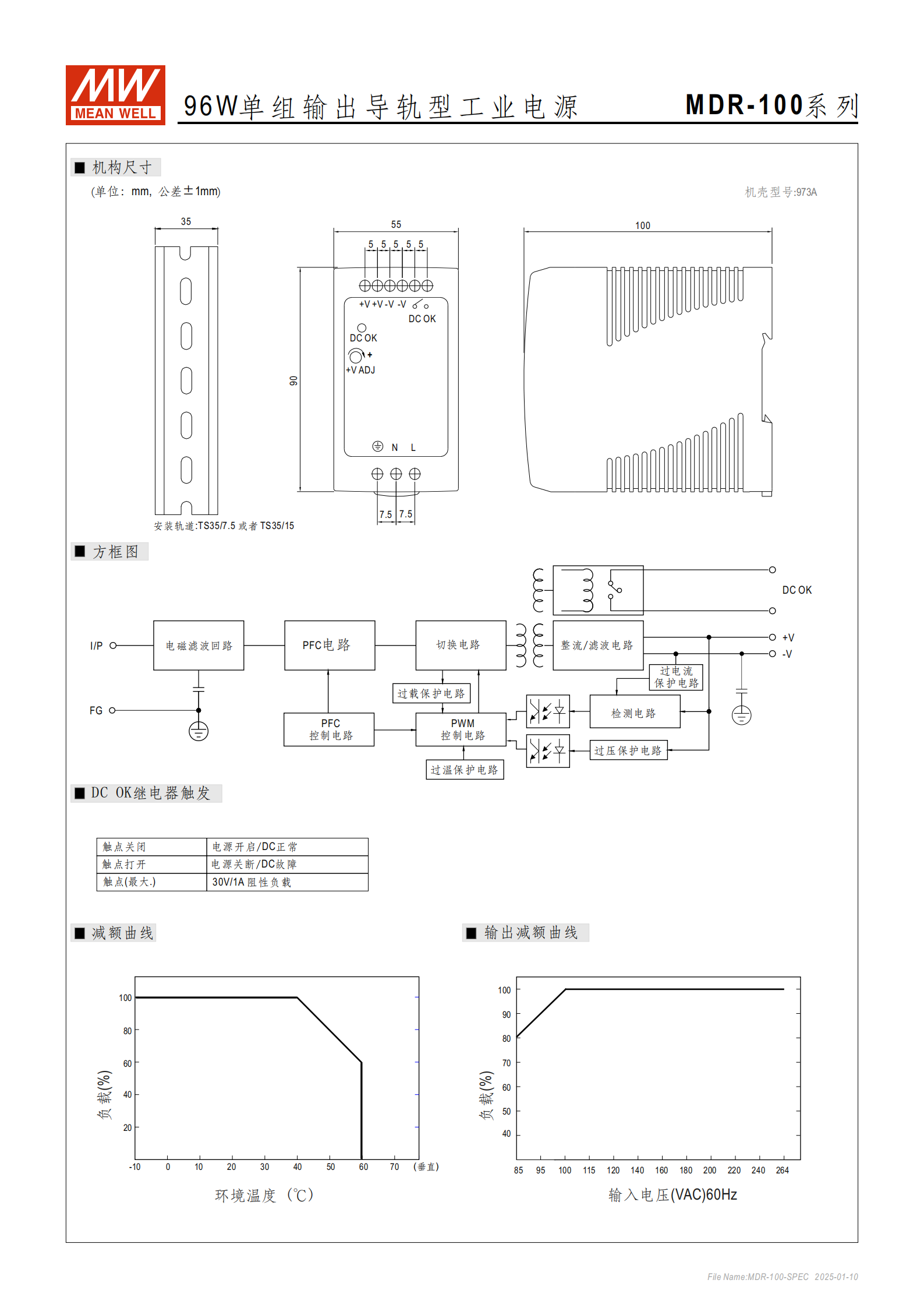 MDR-100 系列是 96W 單組輸出導(dǎo)軌型工業(yè)電源,具備國(guó)際通用全范圍交流輸入、短路 / 過(guò)負(fù)載 / 過(guò)電壓 / 過(guò)溫度多重保護(hù),采用 ZCS/ZVS 技術(shù)及自然風(fēng)冷設(shè)計(jì),支持 TS-35/7.5 或 TS-35/15 導(dǎo)軌安裝,空載功率損耗 < 1W,LED 電源指示、DC OK 繼電器觸動(dòng)功能齊全,經(jīng)過(guò) 100% 滿(mǎn)載老化測(cè)試且提供 3 年保固;輸出涵蓋 12V、24V、48V 三種規(guī)格,額定功率最高 96W,電壓精度 ±1.0%,工作溫度范圍 - 10~+60℃,符合多項(xiàng)國(guó)際安規(guī)與電磁兼容標(biāo)準(zhǔn),MTBF 值最高達(dá) 2217.8K hrs。