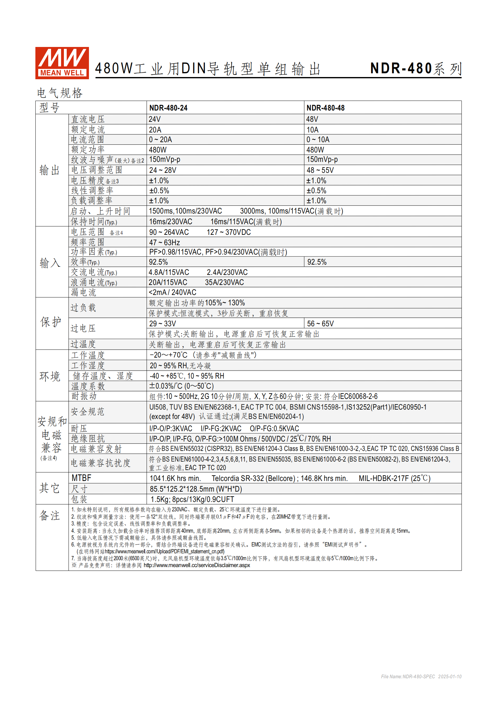 問題 3:NDR-480 系列電源的輸入輸出關(guān)鍵電氣指標(biāo)及環(huán)境適應(yīng)能力如何?