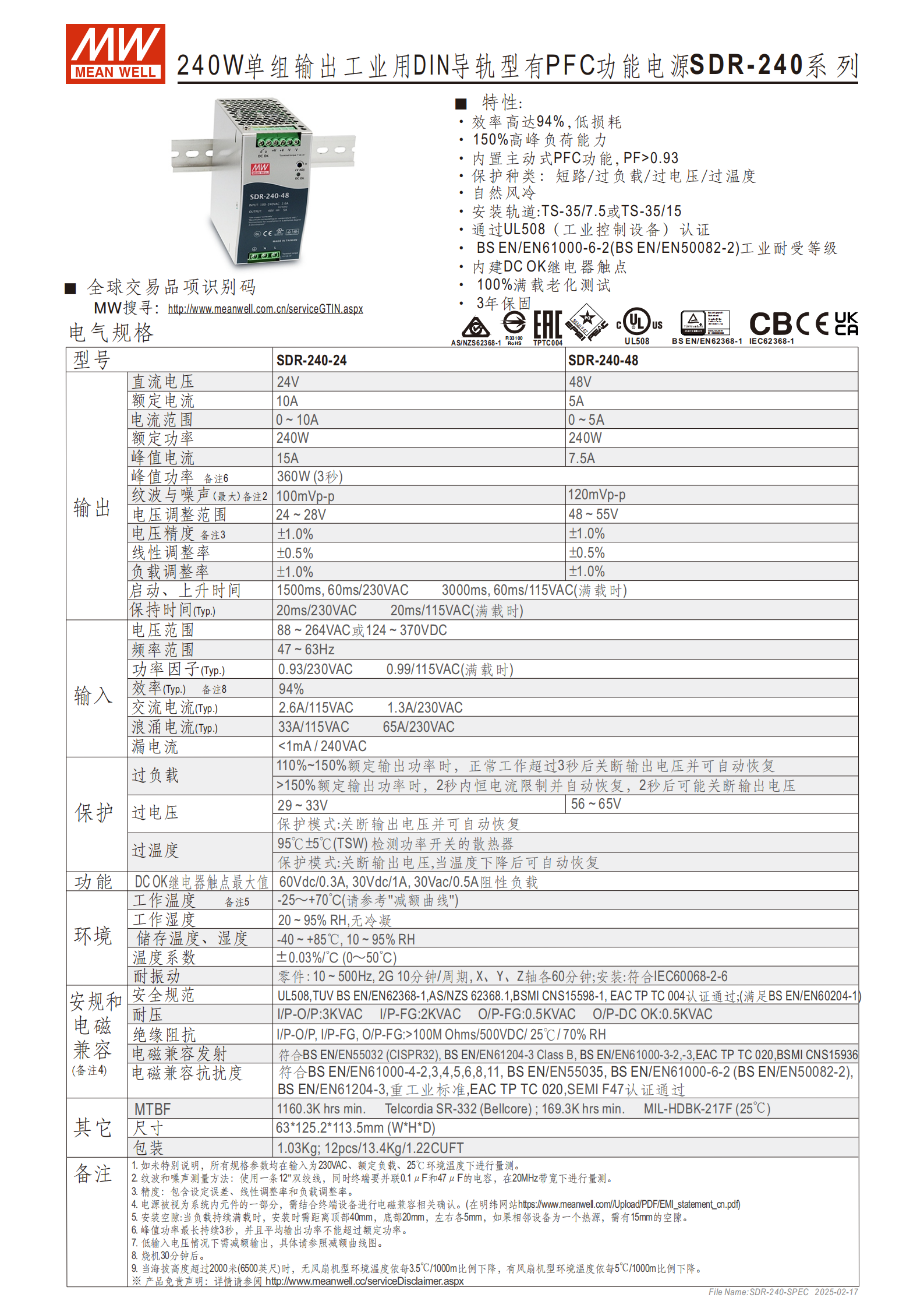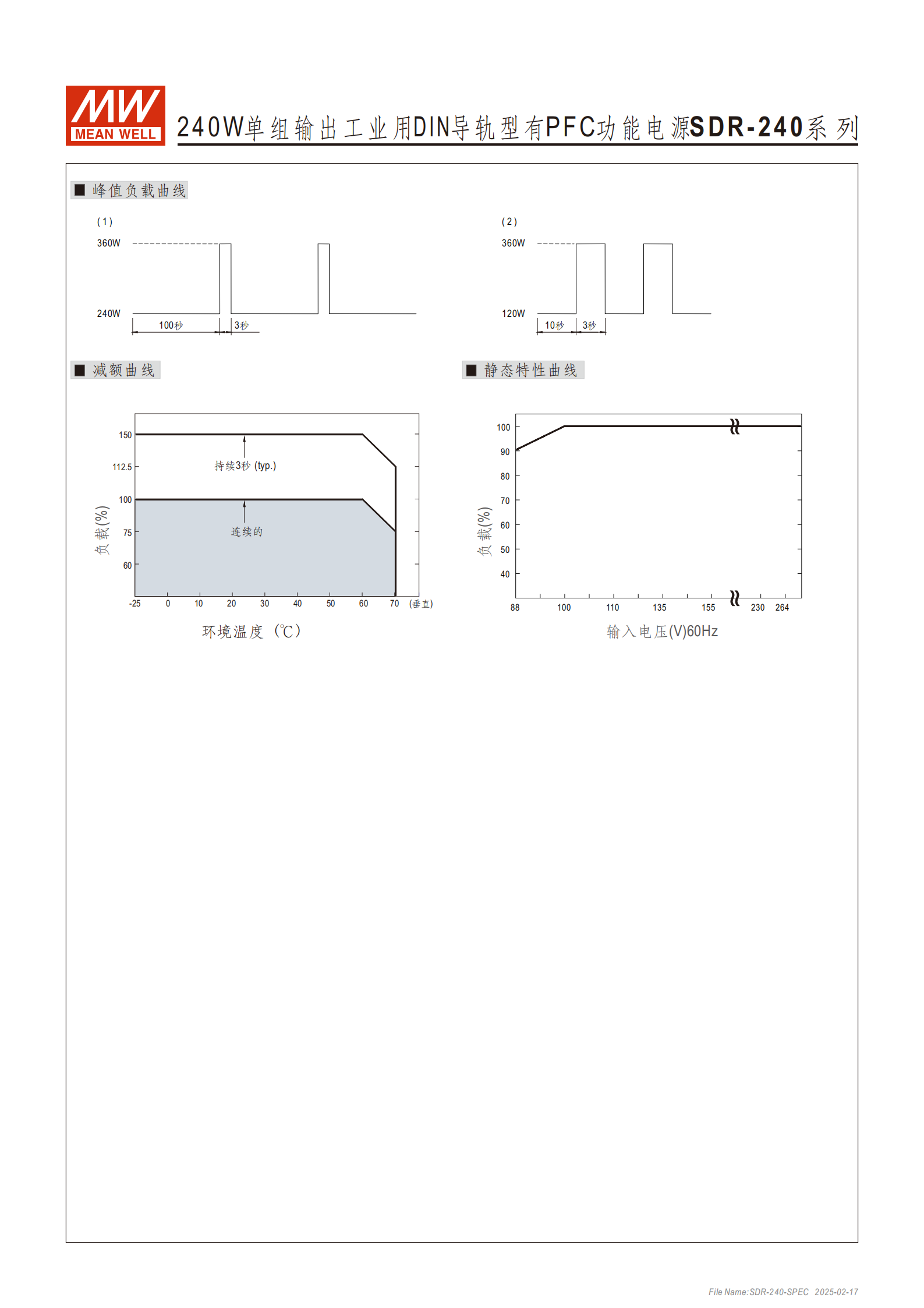 產(chǎn)品名稱(chēng):SDR-240 系列 240W 單組輸出工業(yè)用 DIN 導(dǎo)軌型有 PFC 功能電源