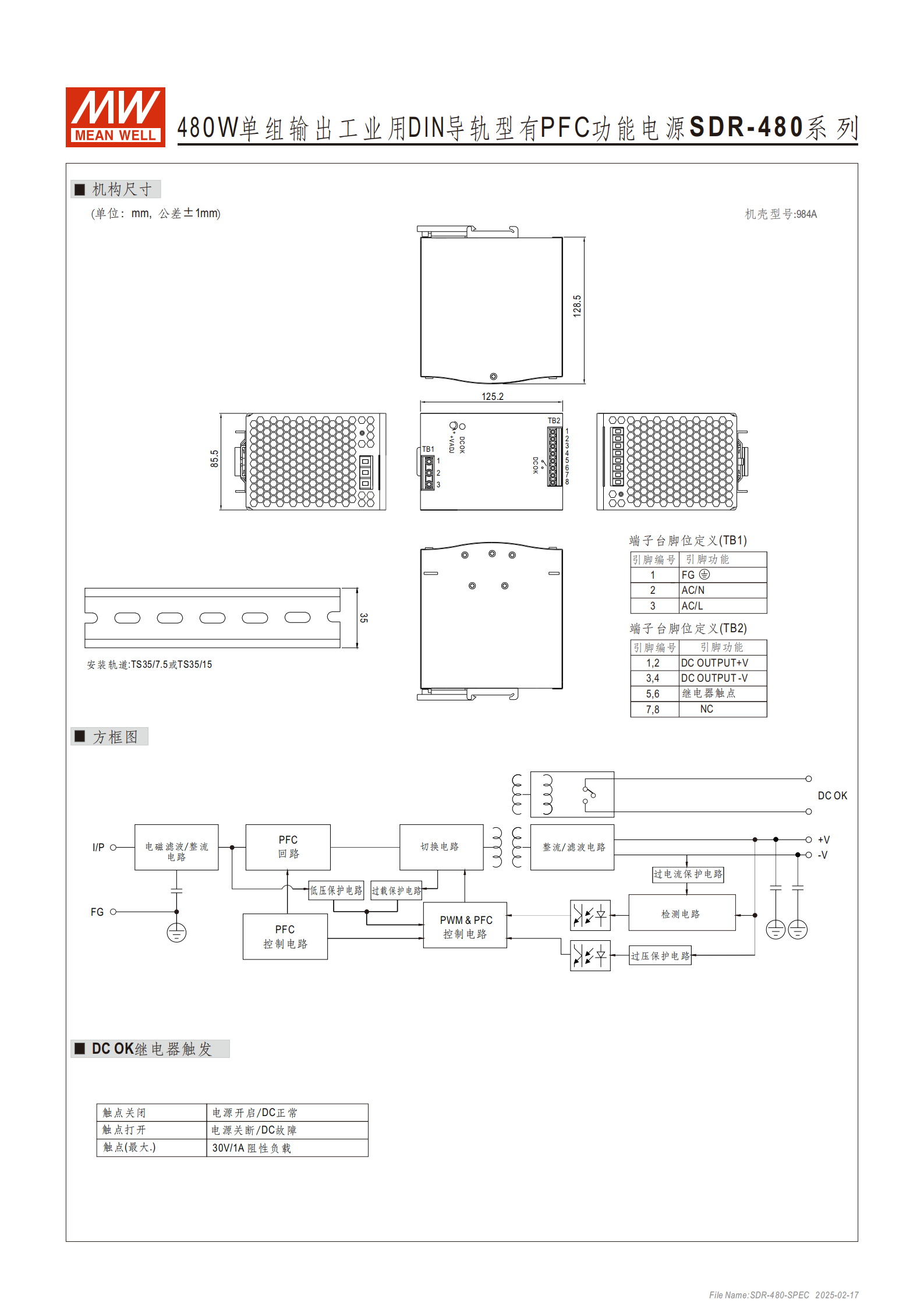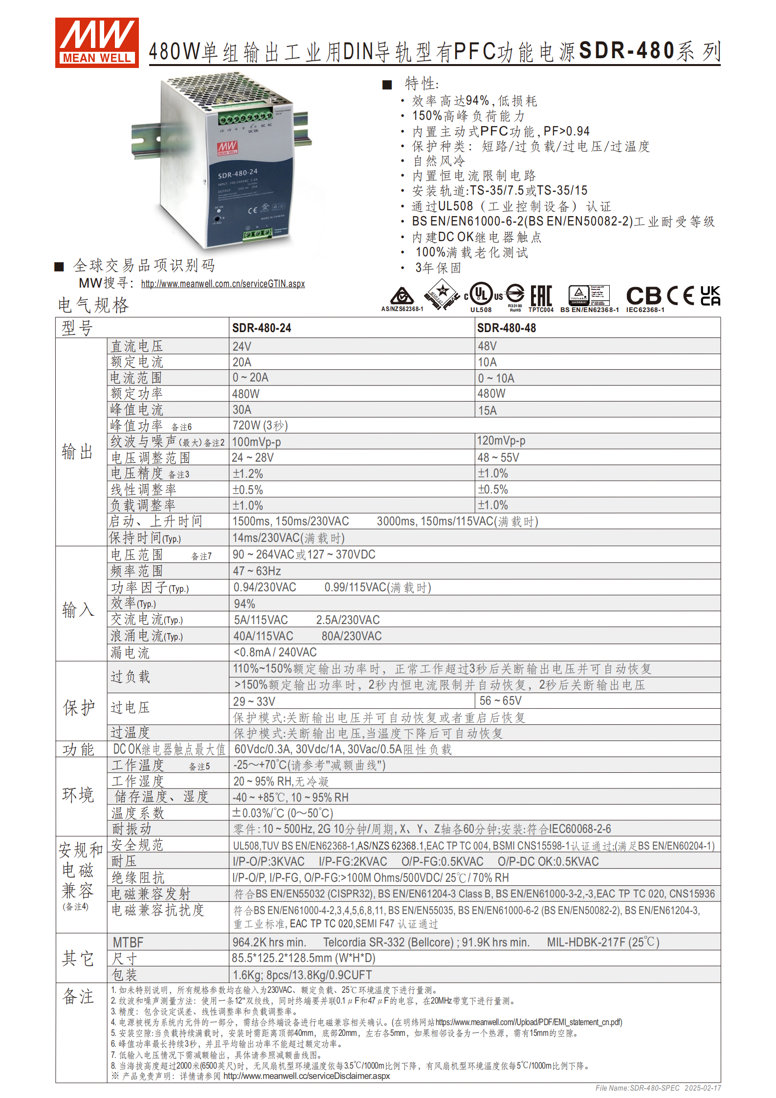 SDR-480 系列是 480W 單組輸出工業(yè)用 DIN 導(dǎo)軌型有 PFC 功能電源,包含 SDR-480-24(24V/20A)和 SDR-480-48(48V/10A)兩種型號,具備效率高達 94% 、150% 高峰負荷能力、內(nèi)置主動式 PFC(PF>0.94)等核心優(yōu)勢,支持短路 / 過負載 / 過電壓 / 過溫度多重保護,通過 UL508 等多項認證,工作溫度范圍 - 25~+70°C,尺寸為 85.5125.2128.5mm,提供 3 年保固,適用于工業(yè)控制等場景。