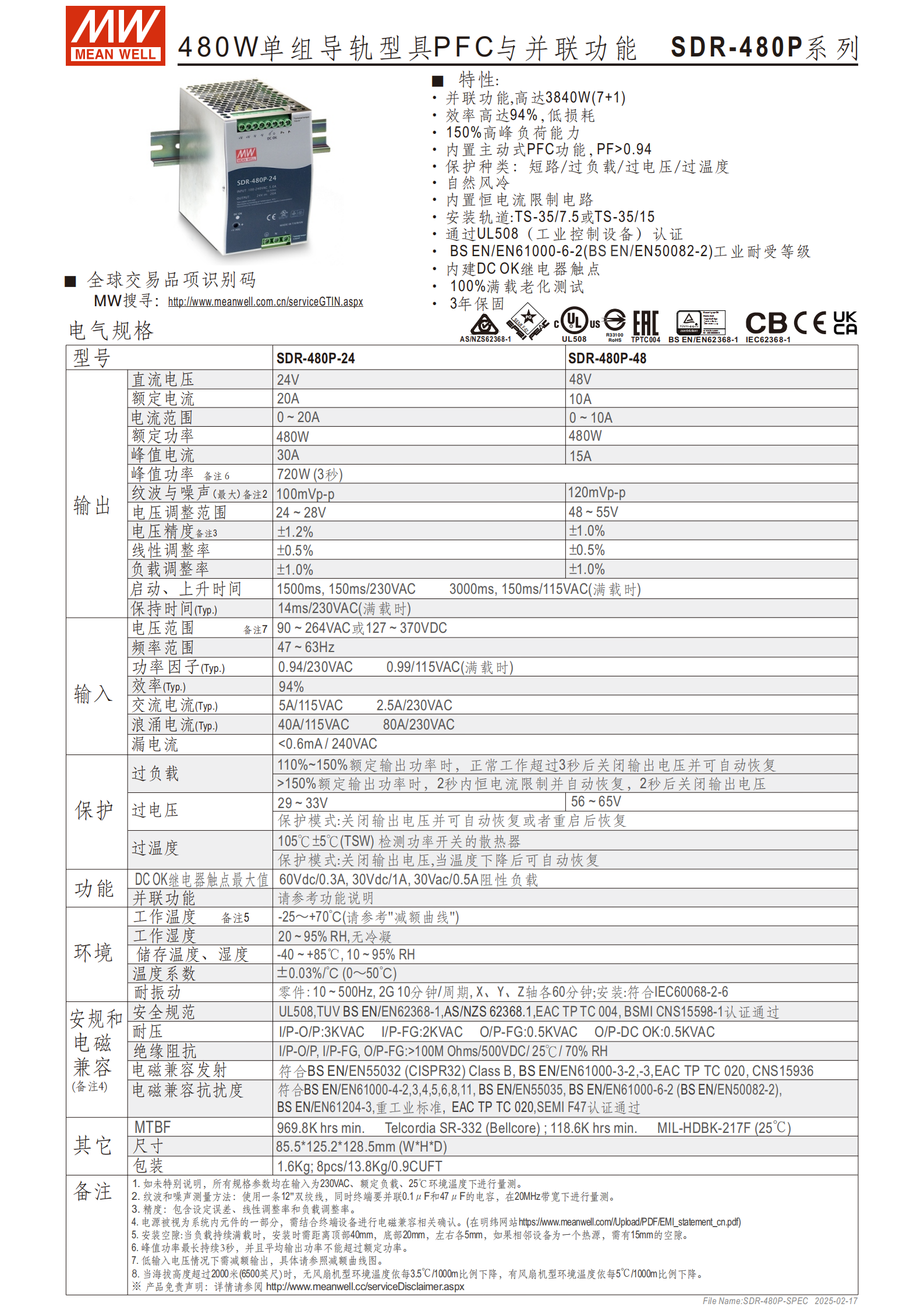 核心定位:480W 單組導(dǎo)軌型電源,內(nèi)置主動(dòng)式 PFC 功能與并聯(lián)功能,適用于工業(yè)控制等場(chǎng)景