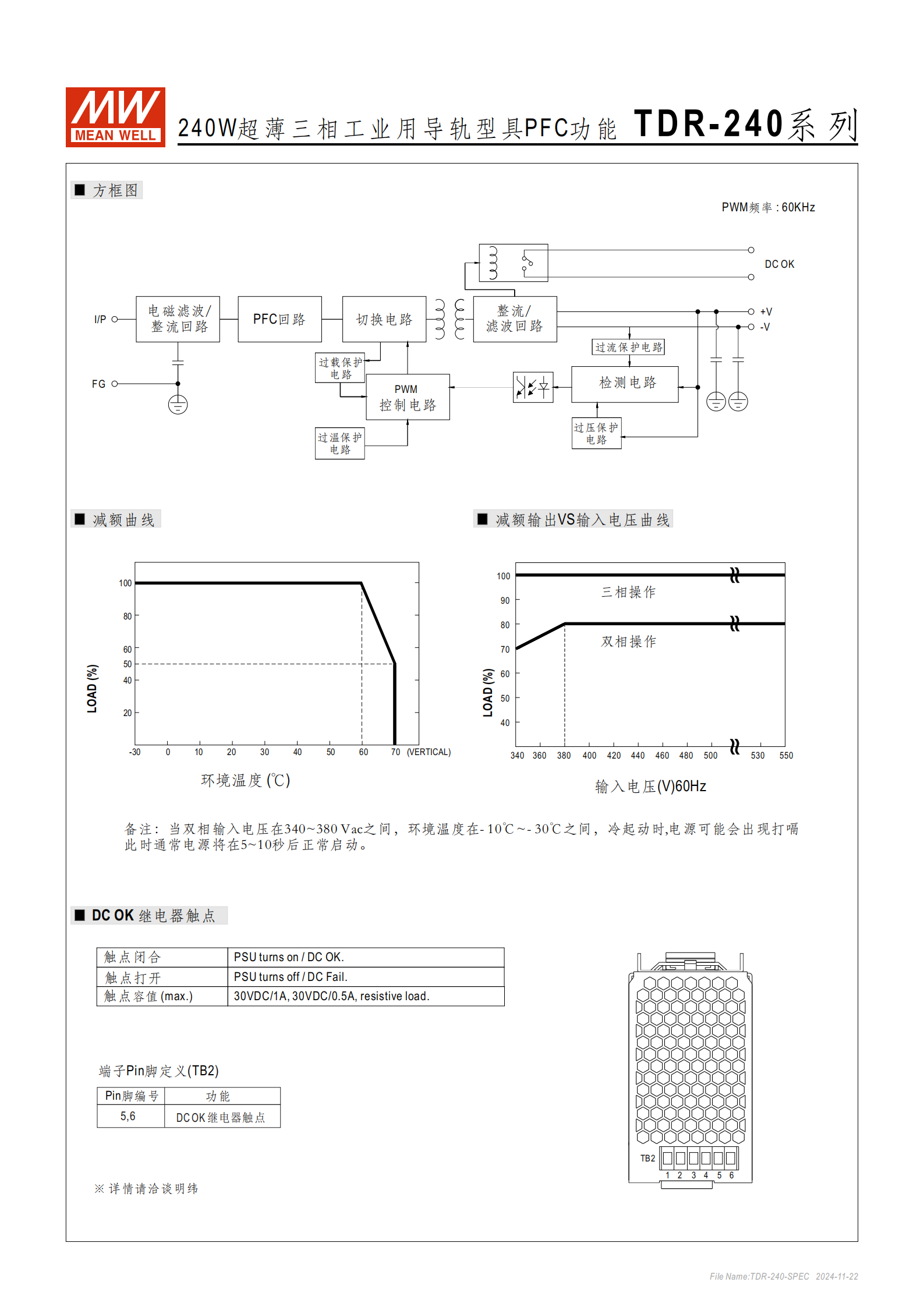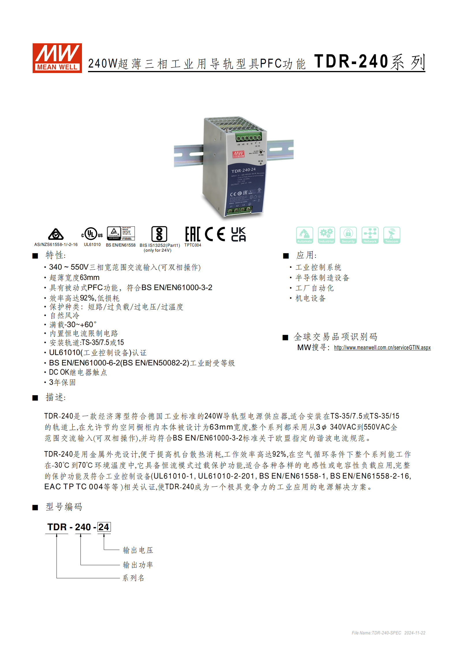 TDR-240 系列是240W 超薄三相工業(yè)用導(dǎo)軌型電源供應(yīng)器,具備PFC 功能,輸入電壓覆蓋340~550VAC 三相(可雙相操作) ,寬度僅63mm,效率高達(dá)92% ,支持 **-30℃~+70℃** 工作溫度,擁有短路、過負(fù)載等多重保護(hù),符合 UL61010 等多項(xiàng)工業(yè)認(rèn)證,適用于工業(yè)控制系統(tǒng)、半導(dǎo)體制造設(shè)備等場景,提供3 年保固。