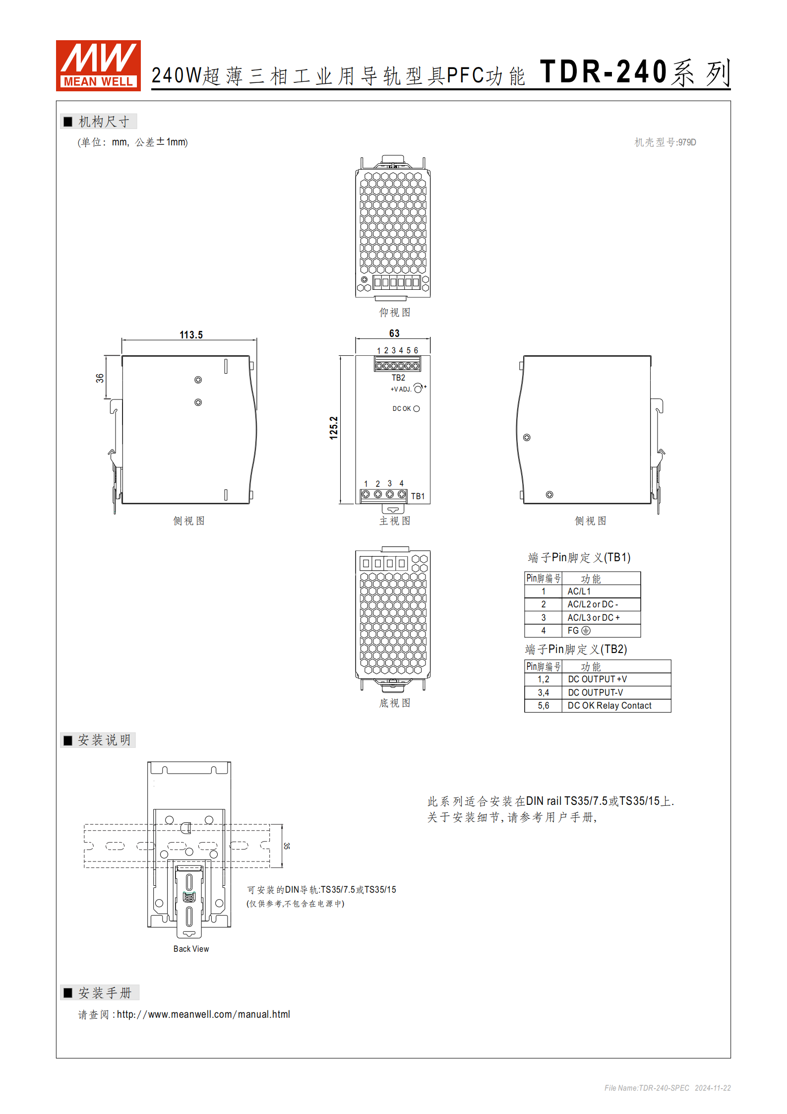 安裝導(dǎo)軌:TS-35/7.5 或 TS-35/15(不含在電源包裝內(nèi));