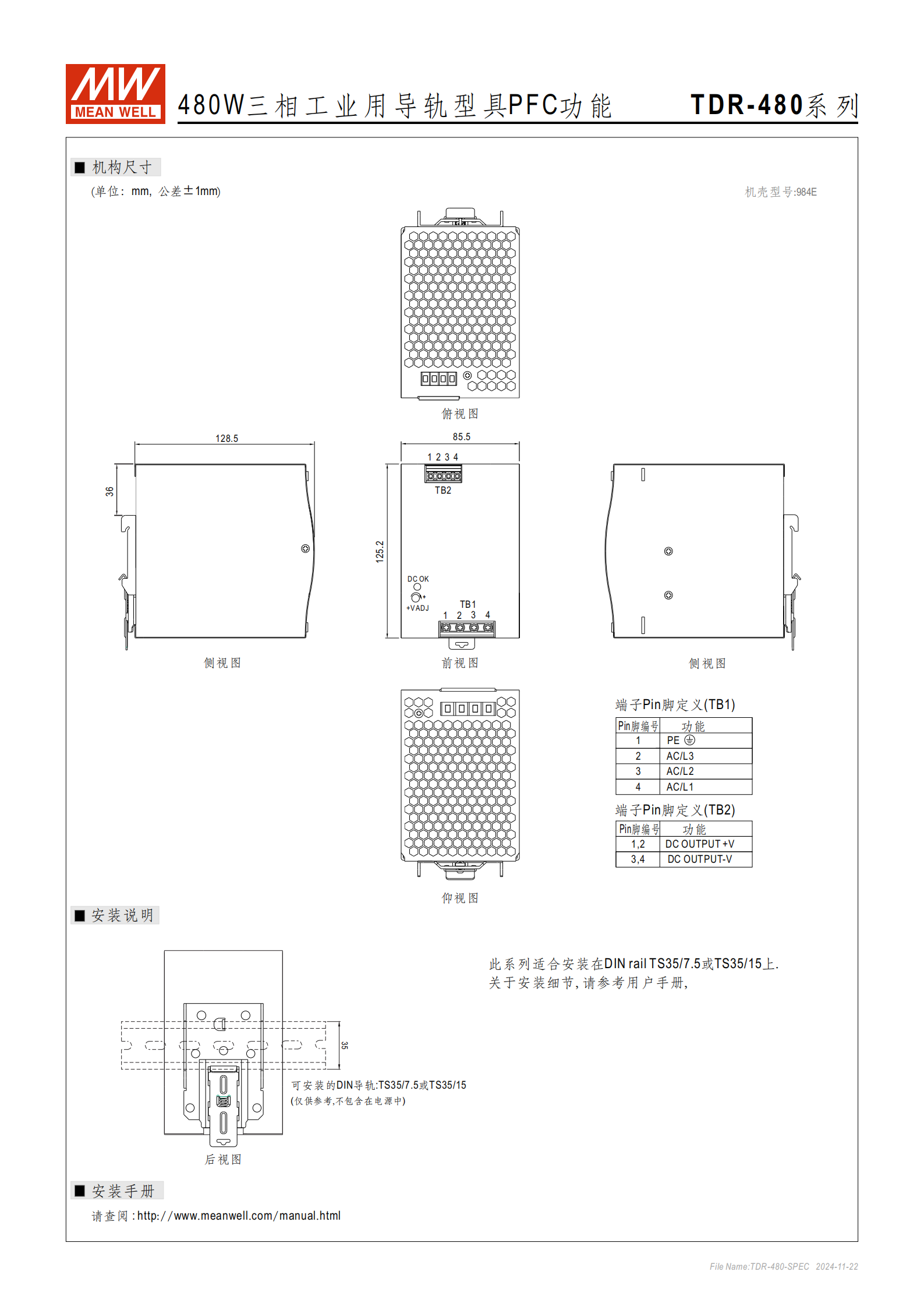 端子定義:TB1(AC 輸入:1=PE、2=AC/L3、3=AC/L2、4=AC/L1);TB2(DC 輸出:1/2=+V、3/4=-V)