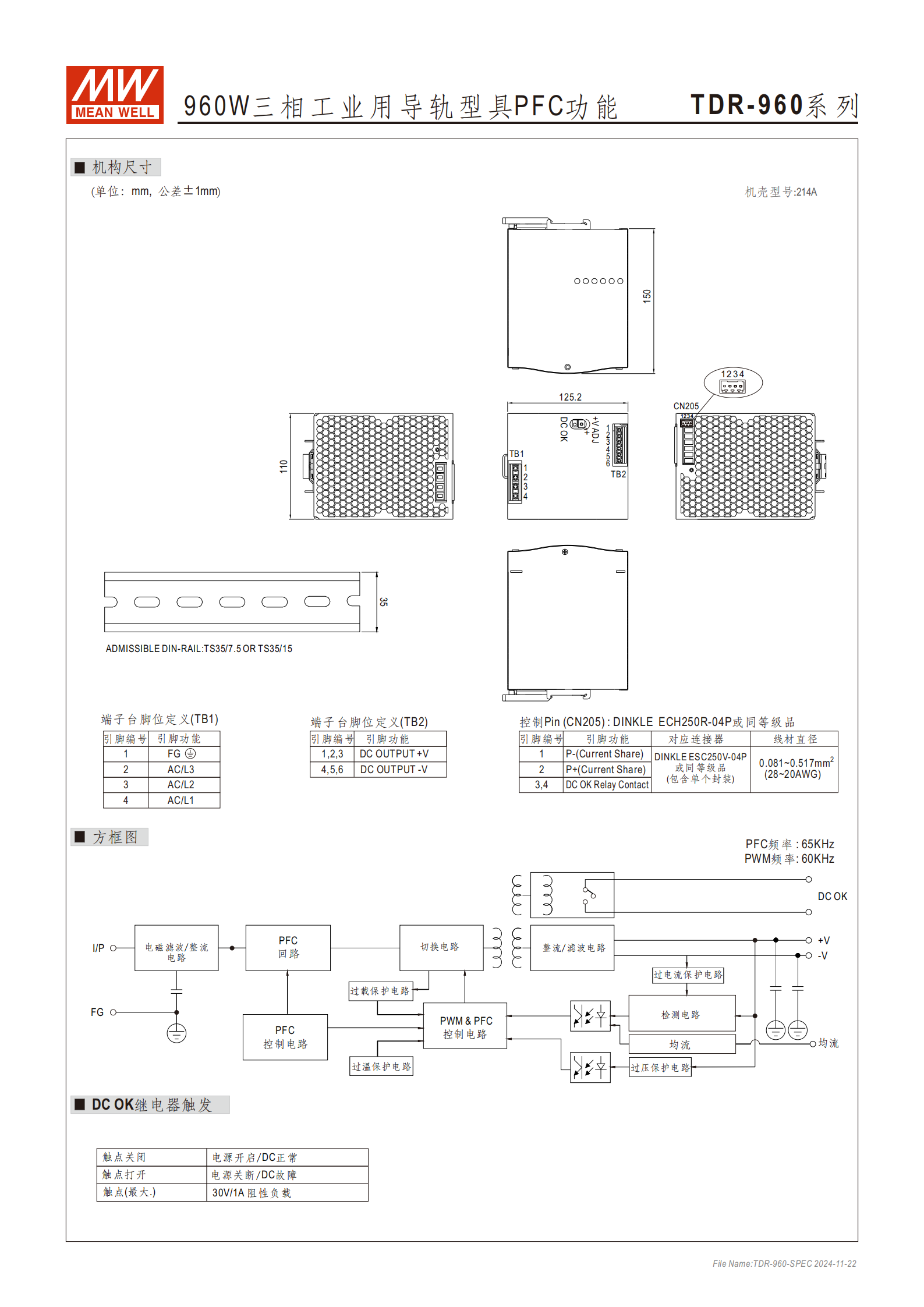 產(chǎn)品類型:960W 三相工業(yè)用導(dǎo)軌型電源,內(nèi)置主動(dòng)式 PFC 功能