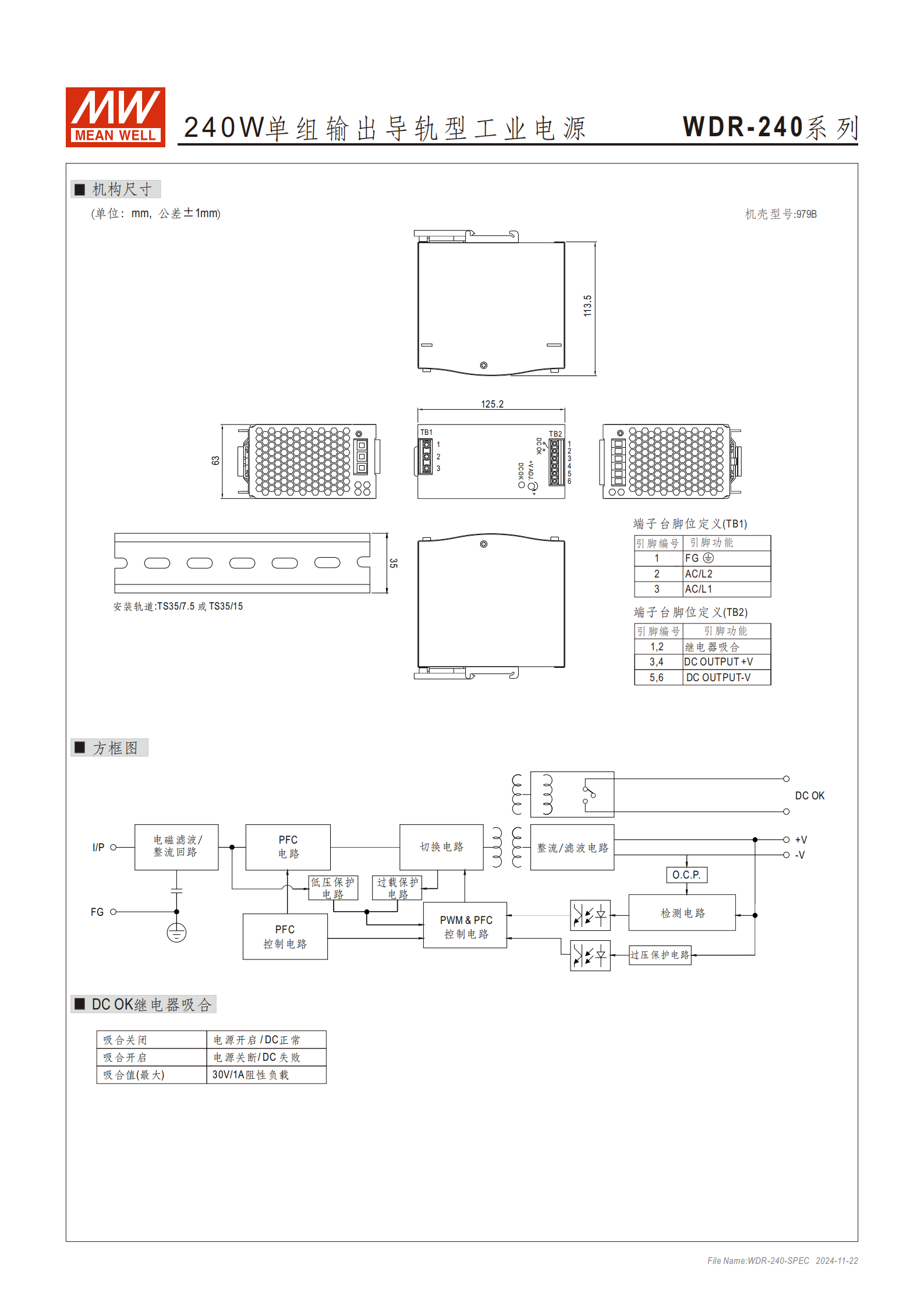 特殊功能:內(nèi)建 DC OK 繼電器觸點(diǎn),吸合值最大為 60Vdc/0.3A、30Vdc/1A、30Vac/0.5A(電阻負(fù)載),吸合狀態(tài)對(duì)應(yīng)電源開啟 / DC 正常,關(guān)閉狀態(tài)對(duì)應(yīng)電源關(guān)斷 / DC 失敗