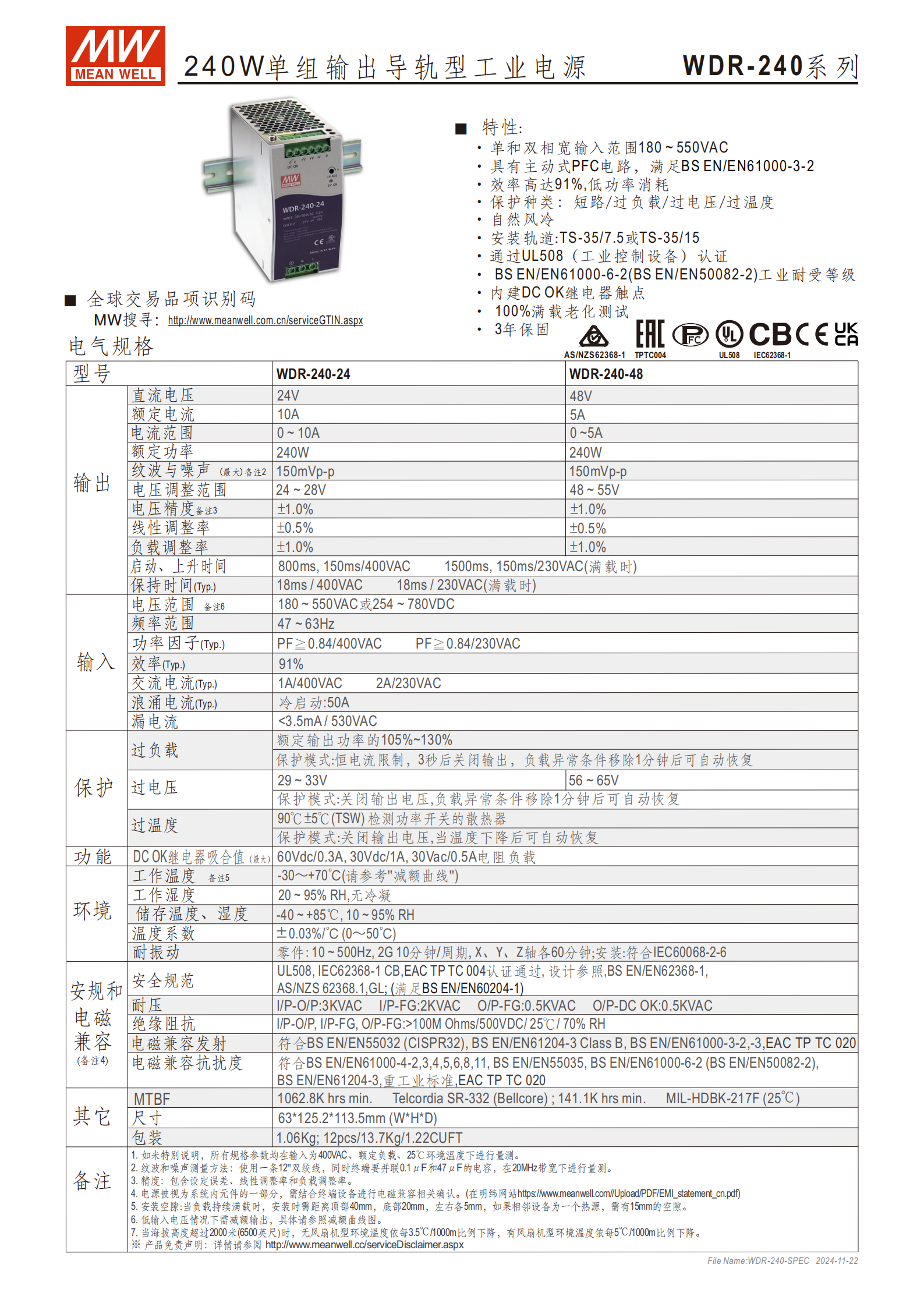 WDR-240 系列240W 單組輸出導(dǎo)軌型工業(yè)電源,涵蓋 WDR-240-24(24V/10A)和 WDR-240-48(48V/5A)兩款型號(hào),具備180~550VAC 寬輸入范圍、高達(dá) 91% 的效率,支持短路 / 過負(fù)載 / 過電壓 / 過溫度多重保護(hù),通過 UL508、IEC62368-1 等多項(xiàng)認(rèn)證,采用 TS-35/7.5 或 TS-35/15 導(dǎo)軌安裝,工作溫度范圍 - 30~+70°C,提供3 年保固,適用于工業(yè)控制等場(chǎng)景。