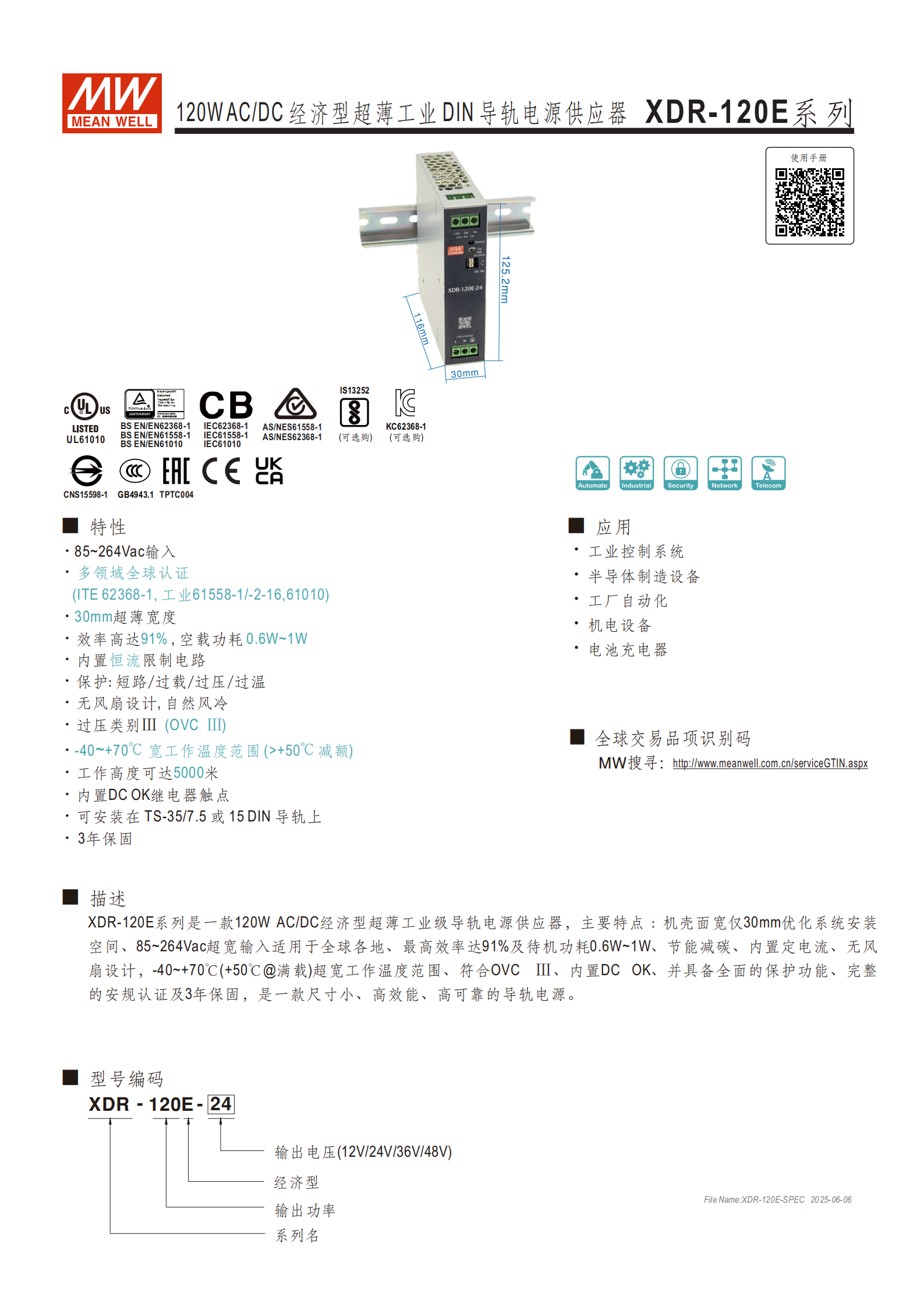 XDR-120E 系列是120W AC/DC 經(jīng)濟(jì)型超薄工業(yè) DIN 導(dǎo)軌電源供應(yīng)器,具備30mm 超薄寬度、85~264Vac 超寬輸入、91% 最高效率及0.6W~1W 空載功耗,輸出電壓涵蓋 12V/24V/36V/48V,支持 **-40~+70℃寬工作溫度范圍 **(+50℃滿載需減額),擁有短路 / 過載 / 過壓 / 過溫全面保護(hù)、OVC Ⅲ 過壓類別及 DC OK 繼電器觸點(diǎn)功能,通過全球多領(lǐng)域安規(guī)認(rèn)證,可安裝于 TS-35/7.5 或 15 DIN 導(dǎo)軌,提供3 年保固,廣泛應(yīng)用于工業(yè)控制系統(tǒng)、工廠自動(dòng)化等場(chǎng)景。