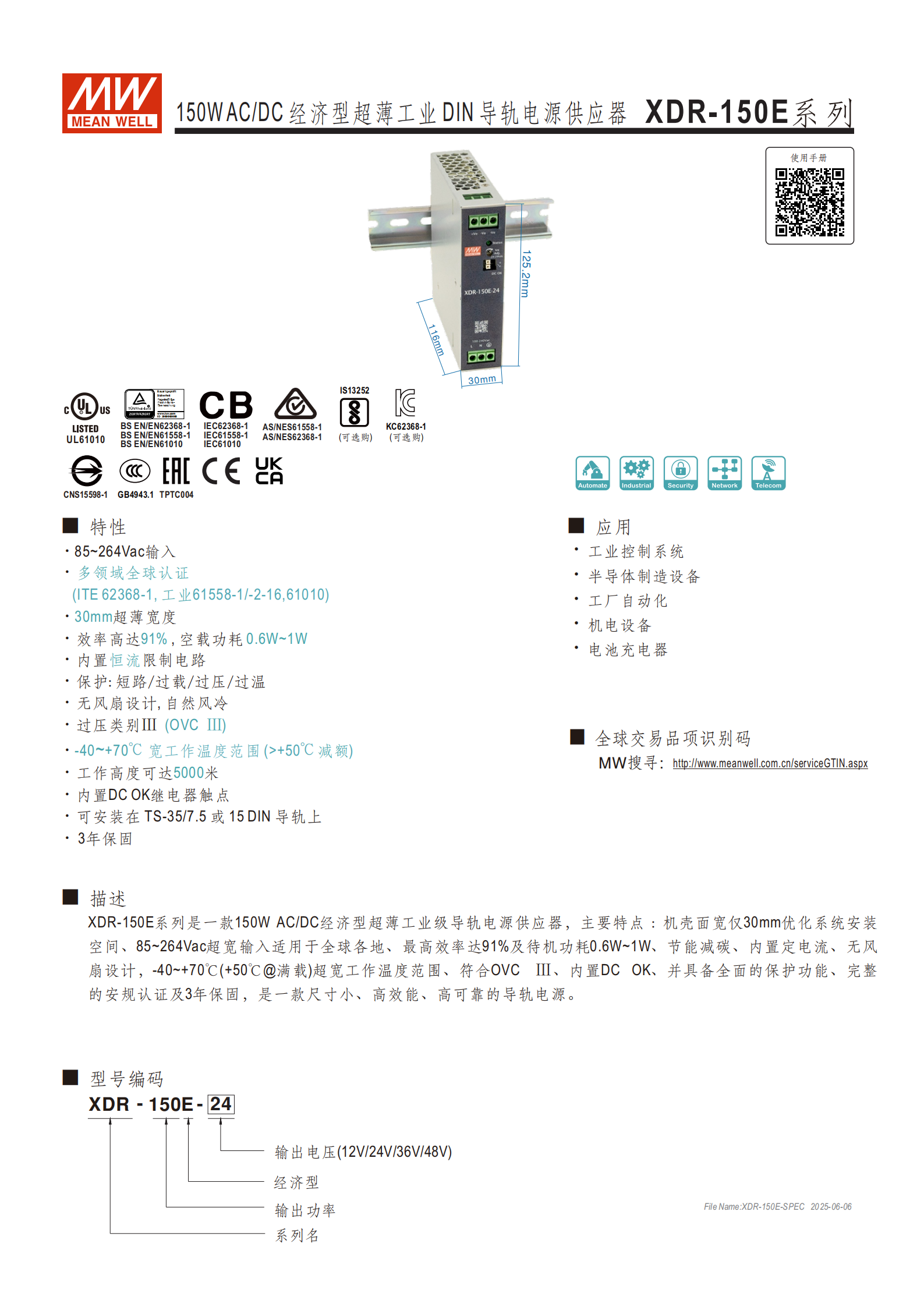 XDR-150E 系列是150W AC/DC 經(jīng)濟型超薄工業(yè) DIN 導(dǎo)軌電源供應(yīng)器,具備85~264Vac 超寬輸入、30mm 超薄寬度、91% 最高效率及0.6W~1W 低空載功耗,支持 **-40~+70℃寬工作溫度范圍 **(+50℃以上需減額),內(nèi)置短路 / 過載 / 過壓 / 過溫保護及 DC OK 繼電器觸點,符合多項全球安規(guī)認證,可安裝于 TS-35/7.5 或 15 DIN 導(dǎo)軌,提供 3 年保固,適用于工業(yè)控制系統(tǒng)、工廠自動化等多類工業(yè)場景。